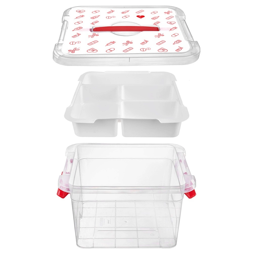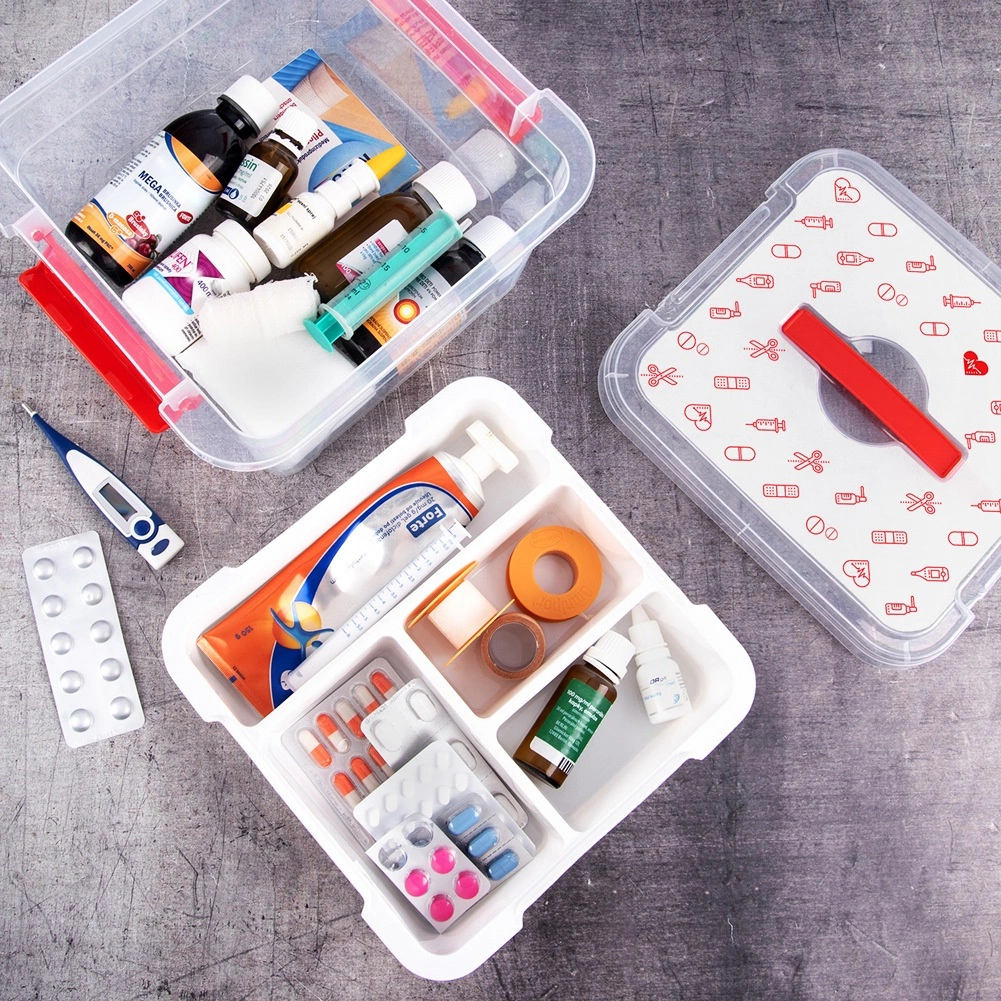 La boîte est fabriquée en plastique résistant avec clips de fermeture robustes et anse ergonomique pour un transport sécurisé. Le couvercle avec icônes rouges (comprimés, thermomètres, seringues, flacons, pansements) indique clairement sa destination – armoire à pharmacie domestique. Convient aux foyers, établissements médicaux, pharmacies et maisons de retraite.