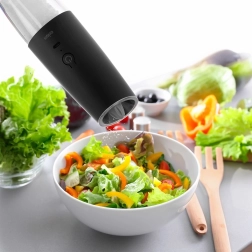 Profitez d’épices fraîchement moulues d’un simple geste. Le moulin électrique avec batterie rechargeable se lance automatiquement lorsqu’il est incliné tête en bas et, grâce à son mécanisme en céramique, il gère même les grains plus durs. Le réservoir transparent permet de contrôler facilement la quantité et la finition noire élégante s’intègre parfaitement au plan de travail comme à la table.