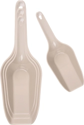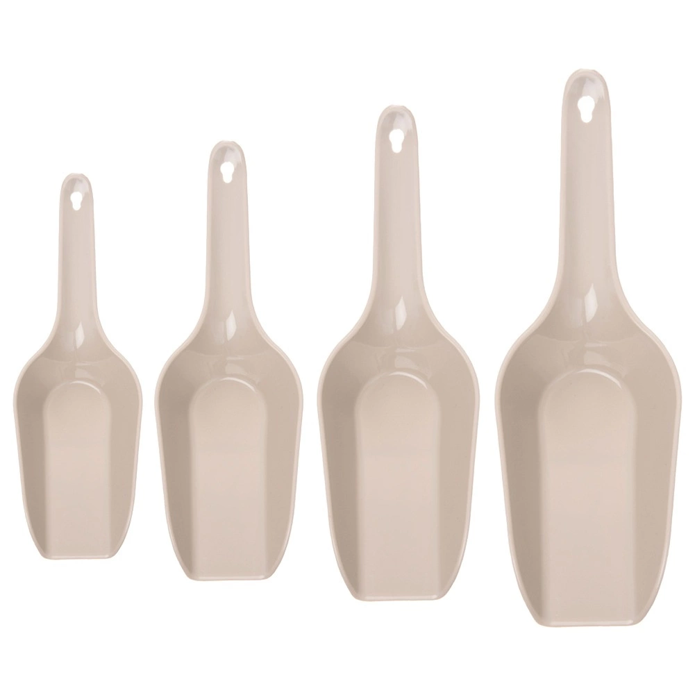 Pratique set de quatre pelles de tailles différentes pour prélever et transvaser facilement des denrées sèches à la maison comme en restauration. Conception en plastique résistant de couleur beige, poignées confortables avec trou de suspension et compatible lave-vaisselle. Utilisation polyvalente pour la farine, le sucre, le café, les flocons, la semoule, la glace ou la nourriture pour animaux de compagnie. Surface lisse pour un nettoyage facile et rangement empilable gain de place.