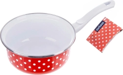 Élégante casserole émaillée 16 cm au style rétro d’une capacité de 950 ml avec des pois blancs, idéale pour la cuisine quotidienne. Fabriquée en acier émaillé de qualité avec rebord en inox, compatible avec tous les types de plaques, y compris l’induction, passe aussi au four et au lave-vaisselle. Parfaite pour les sauces, le lait, faire fondre le beurre ou réchauffer rapidement des portions.