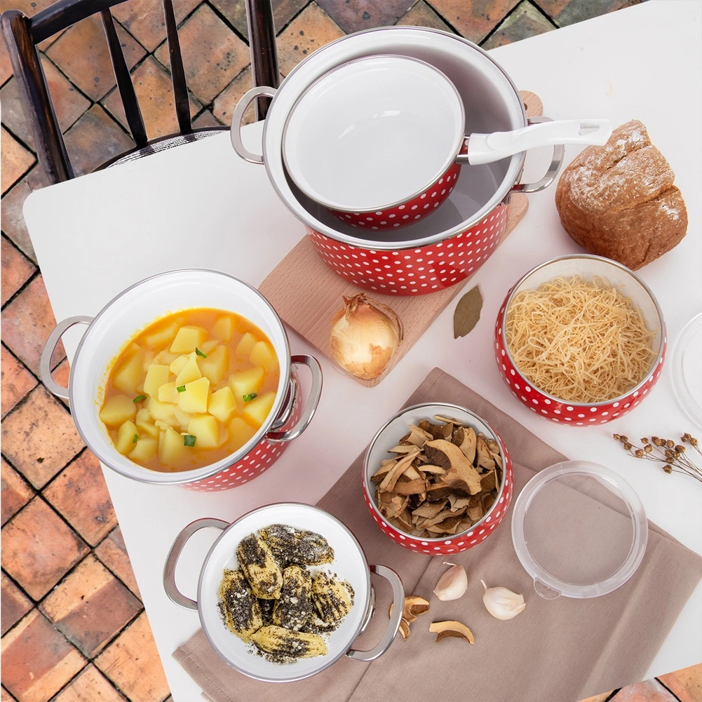 Une casserole élégante au design rétro avec un émail rouge à pois blancs embellira votre cuisine tout en offrant une utilisation pratique au quotidien. Grâce à sa longue poignée, elle tient bien en main et permet de verser facilement. L’émail est sûr pour la santé et convient également aux personnes allergiques.