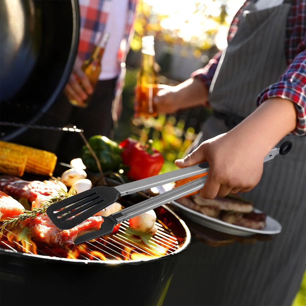 Pratiques et robustes, des pinces de grillade en acier inoxydable de 44 cm avec embouts en nylon résistant à la chaleur. Elles offrent un retournement sûr des viandes et des légumes, disposent d’un verrou pour un rangement compact, sont douces pour les surfaces antiadhésives et passent au lave-vaisselle.