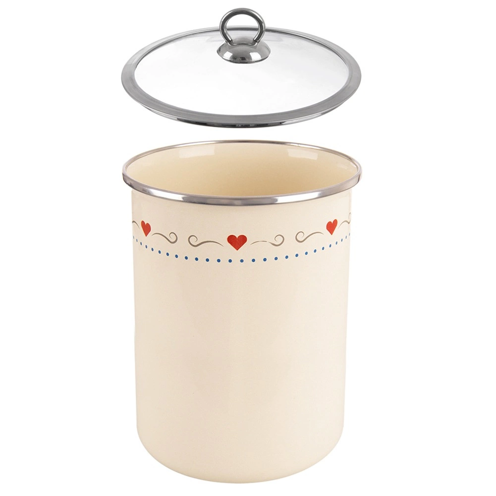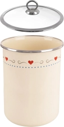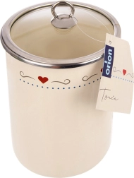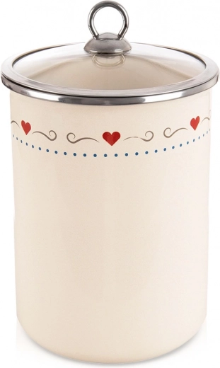 Boîte de cuisine élégante d’une capacité de 1,9 l en acier émaillé de couleur crème avec un délicat motif de cœurs. Équipée d’un couvercle en verre transparent à bord inox pour une meilleure visibilité du contenu et une protection contre l’humidité, les odeurs et les impuretés. Idéale pour la farine, le sucre, le café, le thé ou le riz, entretien facile et grande longévité.