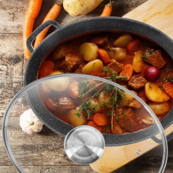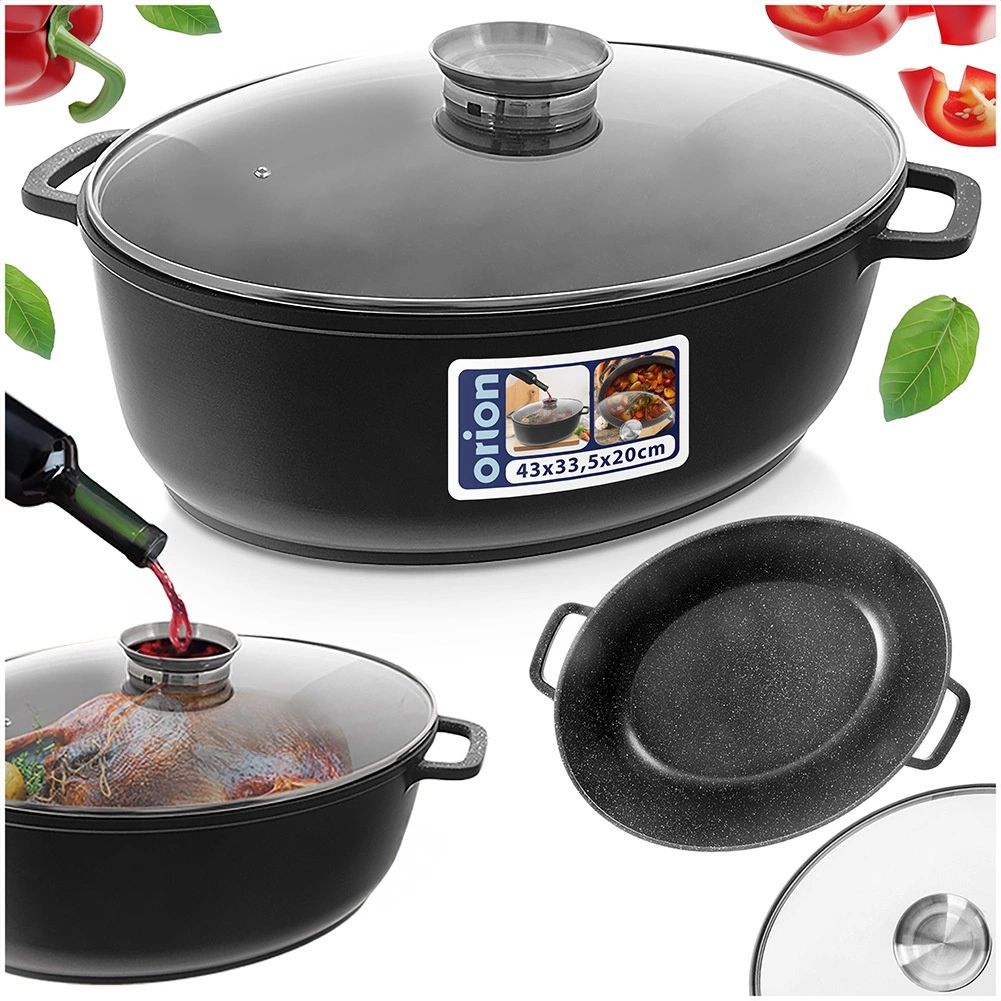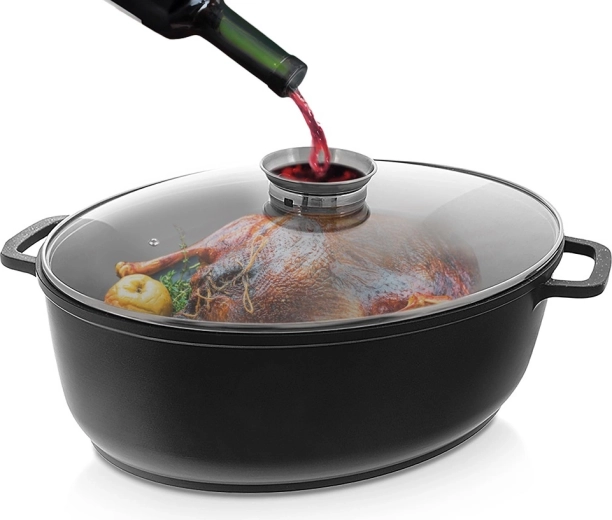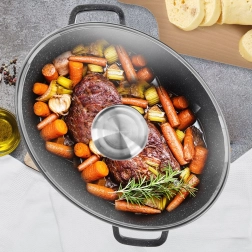 Rôtissoire robuste en aluminium coulé avec une excellente finition de surface granit PFLUON GRANIT, offrant une excellente accumulation de chaleur et maintenant les plats chauds plus longtemps. Le couvercle en verre permet de contrôler la cuisson sans ouverture inutile et le doseur intégré autorise l’arrosage à l’eau ou au vin, ou le dosage d’assaisonnements liquides, directement pendant la cuisson.