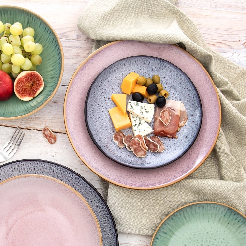 L’émail réactif, délicatement moucheté, confère à l’assiette un aspect original et chaque pièce paraît unique sur une table dressée.