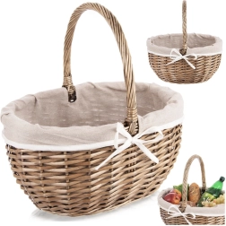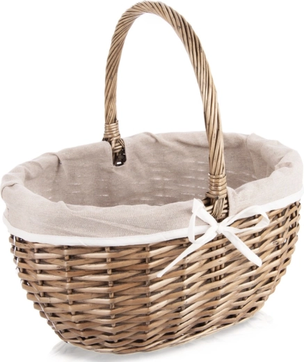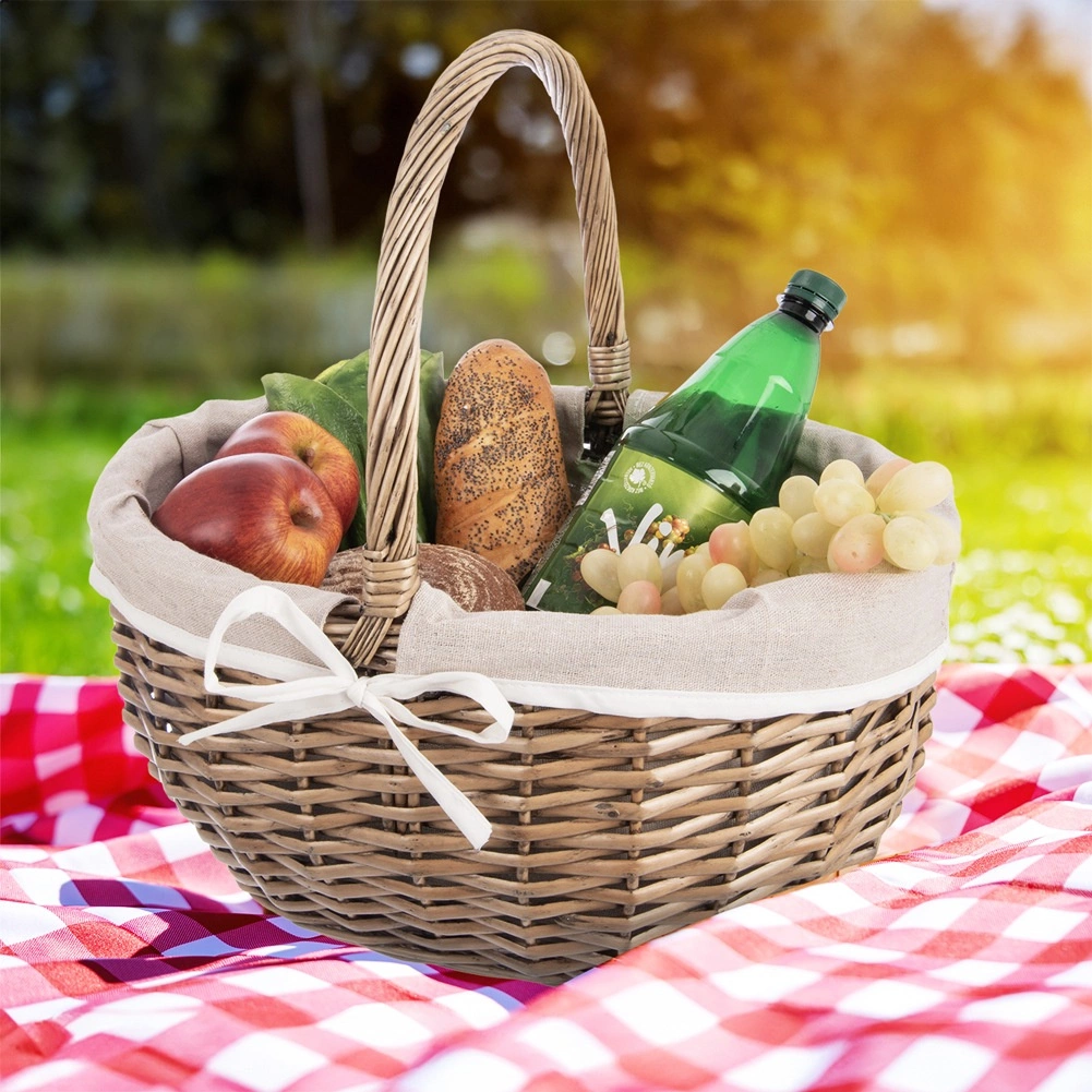 Élégant panier de pique-nique en osier avec anse pratique et doublure en tissu amovible, offrant un tressage artisanal solide en osier naturel, une utilisation polyvalente et un entretien facile. Idéal pour le pique-nique, les courses, le rangement et comme panier à champignons après retrait de la doublure.