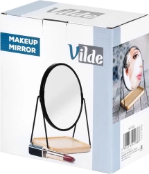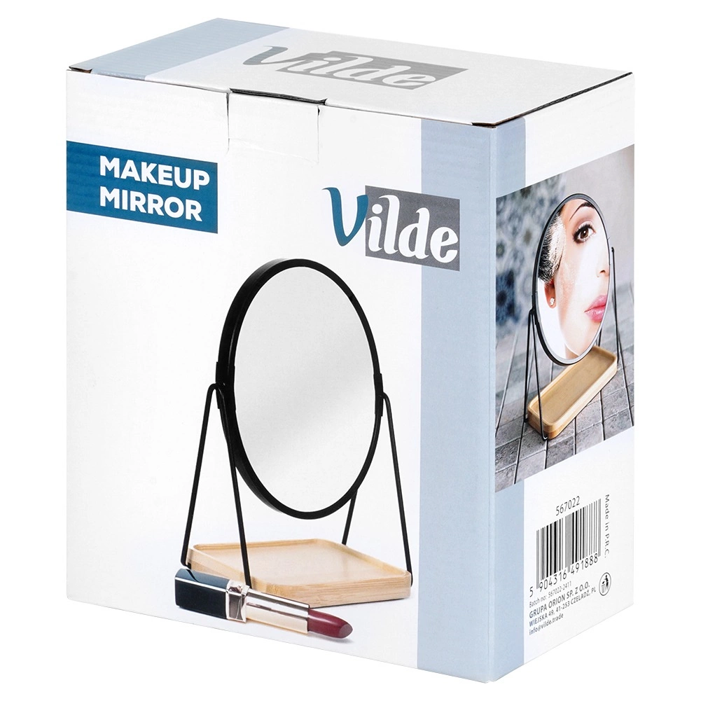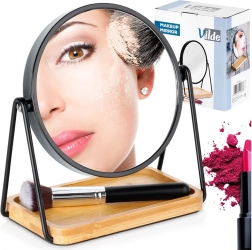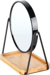 Le miroir cosmétique double face avec une surface de 15 cm de diamètre est idéal pour le maquillage quotidien, la mise en forme des sourcils et les soins détaillés. Le support en métal noir, stable, est complété par une base en bambou naturel qui sert également de plateau de rangement pratique pour pinceaux, accessoires cosmétiques ou bijoux. Son design minimaliste mêlant blanc et bois s’intègre facilement aux intérieurs modernes.