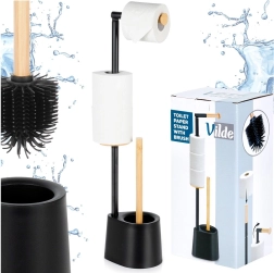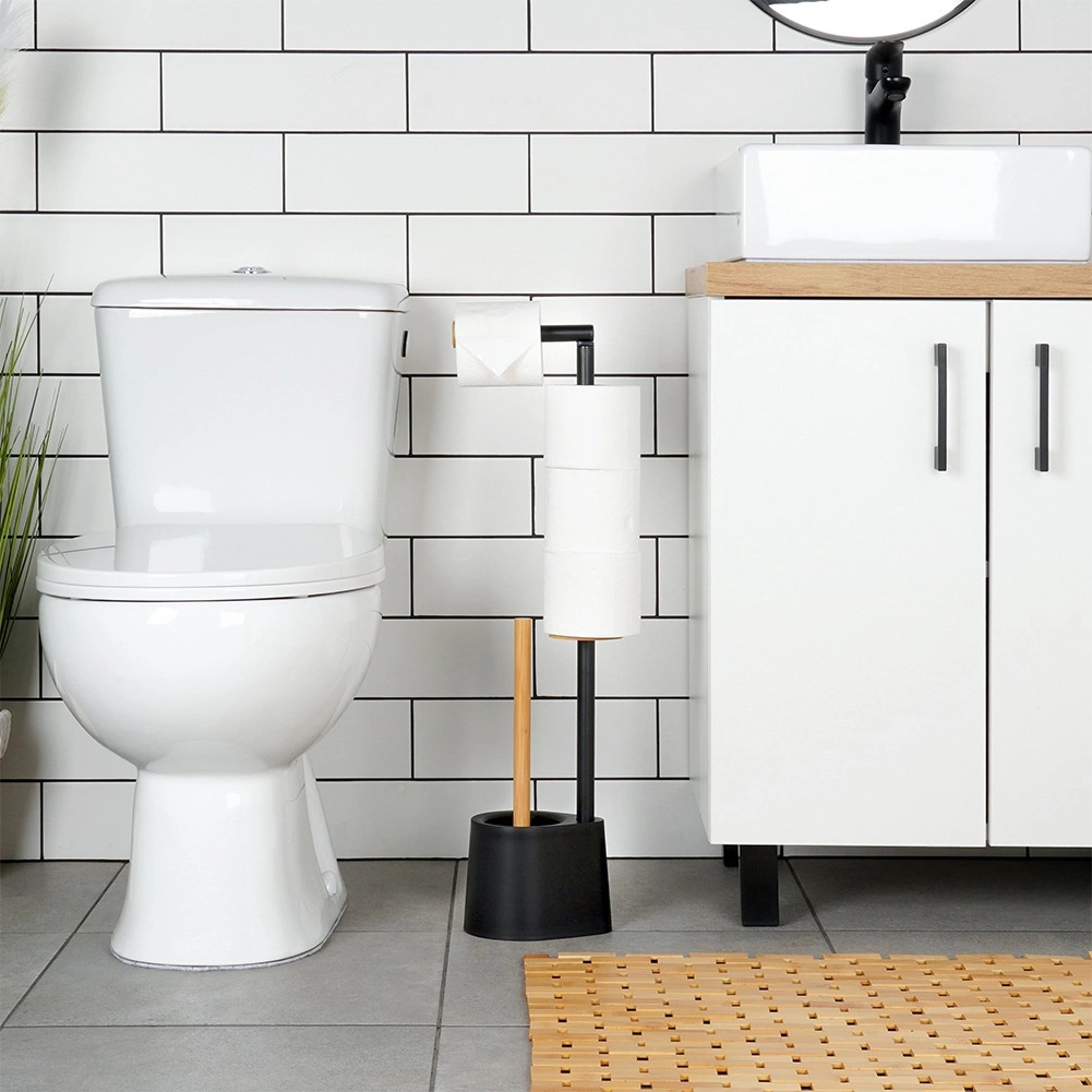 Gardez votre salle de bain ordonnée grâce à ce support astucieux qui distribue et stocke le papier toilette et intègre une brosse WC à poils en silicone pour un nettoyage hygiénique. Son design minimaliste noir avec accent naturel en bambou est élégant et intemporel.