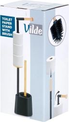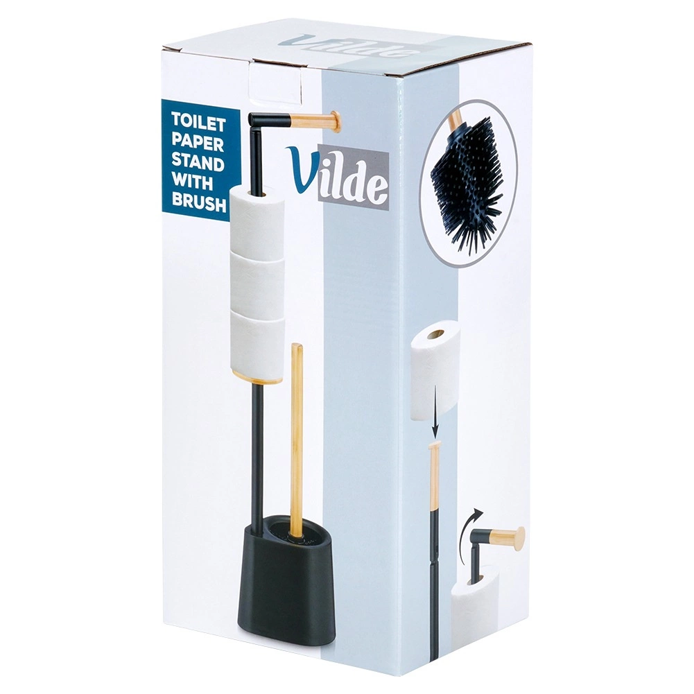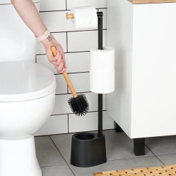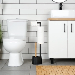 Pratique set 2-en-1 pour les toilettes combinant un porte-papier toilette, un rangement pour jusqu’à 3 rouleaux de rechange et une brosse WC à fibres en silicone. L’élégante finition noire avec poignée en bambou s’intègre parfaitement aux salles de bain modernes comme classiques. Base stable, dimensions compactes et possibilité d’orienter le bras supérieur verticalement pour un rouleau supplémentaire garantissent une flexibilité maximale et un espace ordonné.