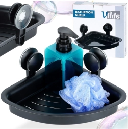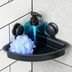 Pratique étagère d’angle de douche à fixation par ventouses offrant un espace de rangement stable sans perçage. Finition noire mate, avec orifices de drainage pour un séchage rapide et un nettoyage facile. Idéale pour gels douche, shampoings, savon et éponges sur surfaces lisses comme le carrelage ou le verre.