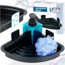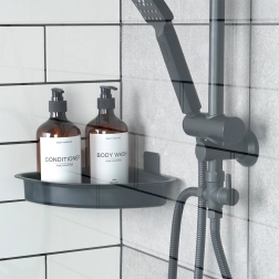 La forme triangulaire exploite efficacement le coin de la douche et garde les produits à portée sans encombrer.
