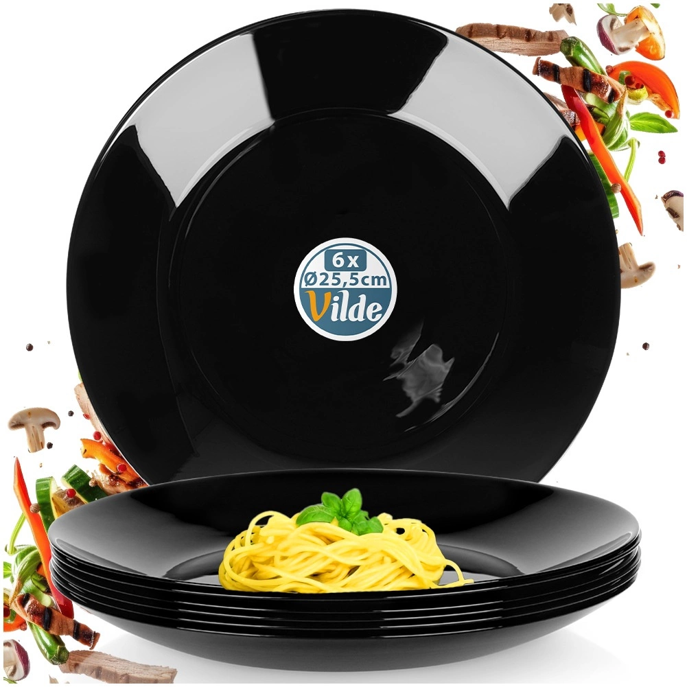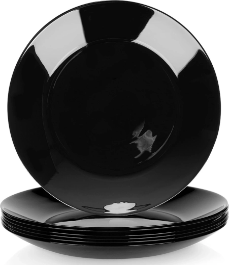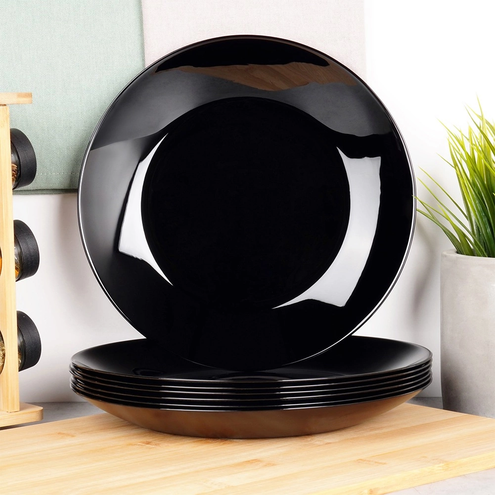 Set de 6 assiettes plates universelles en verre opale de qualité, avec une élégante brillance noire. Grâce à leur look intemporel et leur conception robuste, elles complètent à merveille votre service de table, du repas de tous les jours au banquet festif. Le matériau évoque la porcelaine tout en restant pratique à entretenir et durable dans le temps.