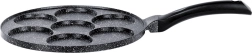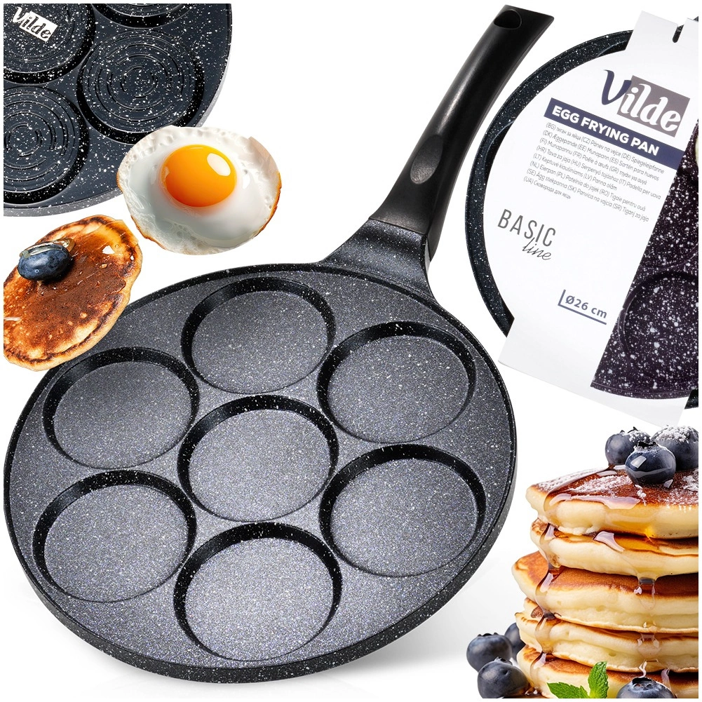 Poêle pratique en granite avec 7 cavités rondes (Ø 8 cm) pour des œufs, pancakes et mini crêpes parfaitement formés. Corps en aluminium léger avec revêtement antiadhésif pour une cuisson avec un minimum de matière grasse, répartition uniforme de la chaleur et poignée ergonomique avec œillet de suspension. Compatible avec plaques gaz, électriques et vitrocéramiques et lavable au lave-vaisselle.