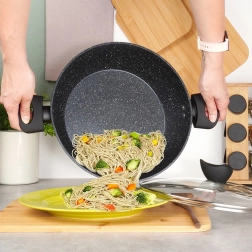 La couche granit spéciale minimise l’adhérence et permet de cuisiner avec moins d’huile. Les aliments se détachent facilement et la poêle se nettoie rapidement.