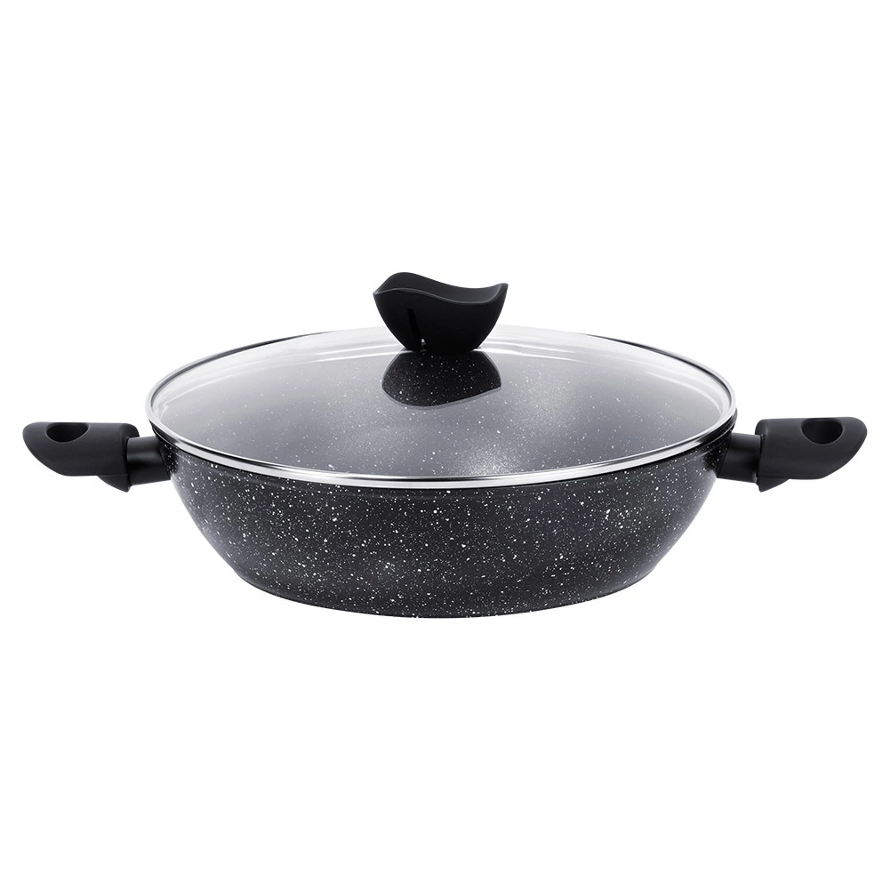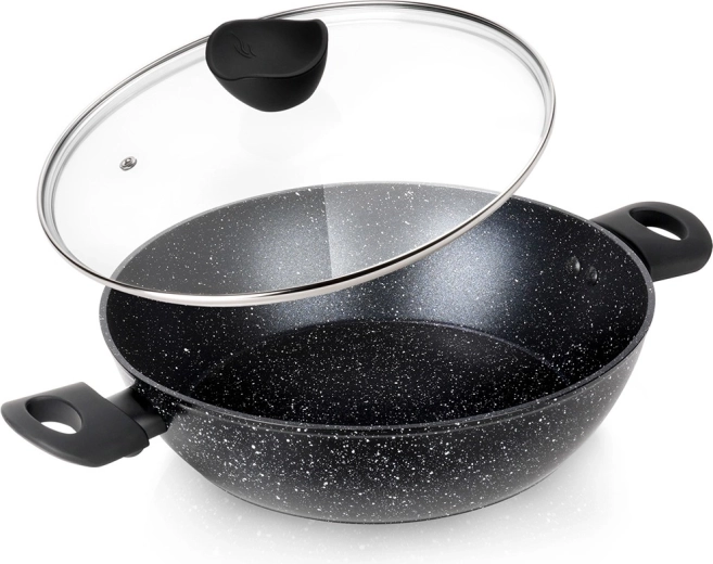 Poêle profonde pratique et résistante avec couvercle en verre, diamètre 28 cm et capacité 3,5 l, pour la cuisson, la friture et le mijotage au quotidien. Grâce au revêtement granit antiadhésif, vous cuisinez avec un minimum de matière grasse, la répartition uniforme de la chaleur économise de l’énergie et le fond universel compatible avec tous les types de plaques, y compris l’induction garantit une large utilisation. Les poignées Soft Touch sont confortables et résistantes à la chaleur, l’ustensile est compatible lave-vaisselle.