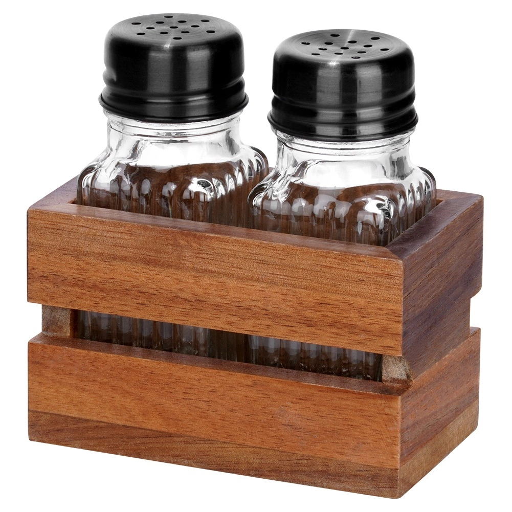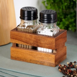 Ce set de 3 pièces allie fonctionnalité et style : deux pots en verre (pour le sel et le poivre) sont complétés par un support compact en bois d’acacia, qui facilite le transport et l’organisation sur la table. Le verre cannelé offre une bonne prise en main et le bouchon vissé perforé assure une répartition régulière sans risque de surdosage.