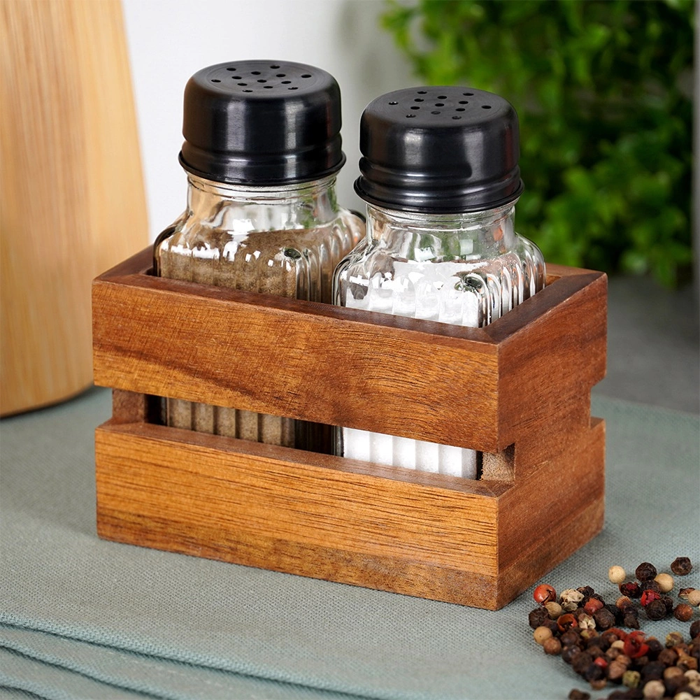 Le support compact en bois maintient les pots d’épices réunis, facilite le transport et apporte à la table une touche naturelle et rustique.