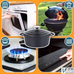 Convient au gaz, à l’électricité, au vitrocéramique, à l’halogène et à l’induction. Peut également être utilisé au four, sur le gril ou au-dessus d’un feu de camp.