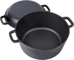 Cocotte en fonte de 4,5 l avec couvercle pratique (1,6 l), utilisable aussi comme poêle peu profonde ou petit plat à four. La construction tout en fonte se distingue par une excellente conduction et conservation de la chaleur, garantissant des plats juteux, bien cuits à cœur et longtemps chauds au service.