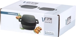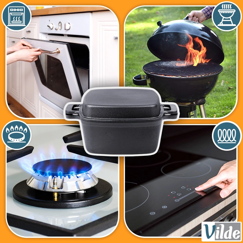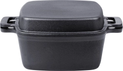 Cocotte carrée universelle en fonte 2-en-1 avec un couvercle qui sert également de poêle/plat à four indépendant. La fonte massive conduit et accumule parfaitement la chaleur, est résistante aux hautes températures et convient à tous les types de plaques, y compris l’induction, au four, au barbecue et au feu direct. Idéale pour mijoter, rôtir, préparer des soupes, des goulaschs et des gratins. Produit original VILDE de la ligne CAST LINE.