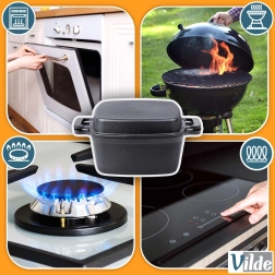 - Utilisation universelle – gaz, électricité, vitrocéramique, halogène, induction, four, barbecue et feu ouvert.