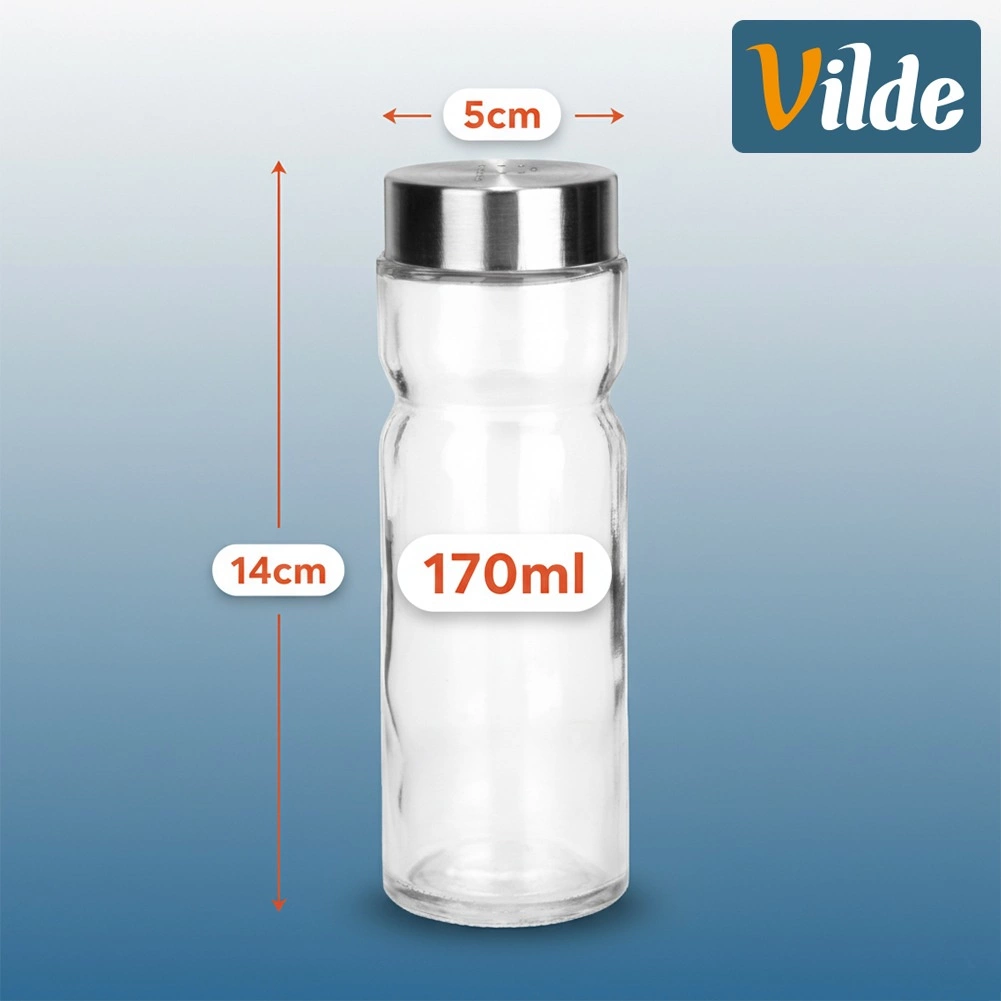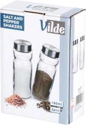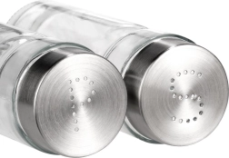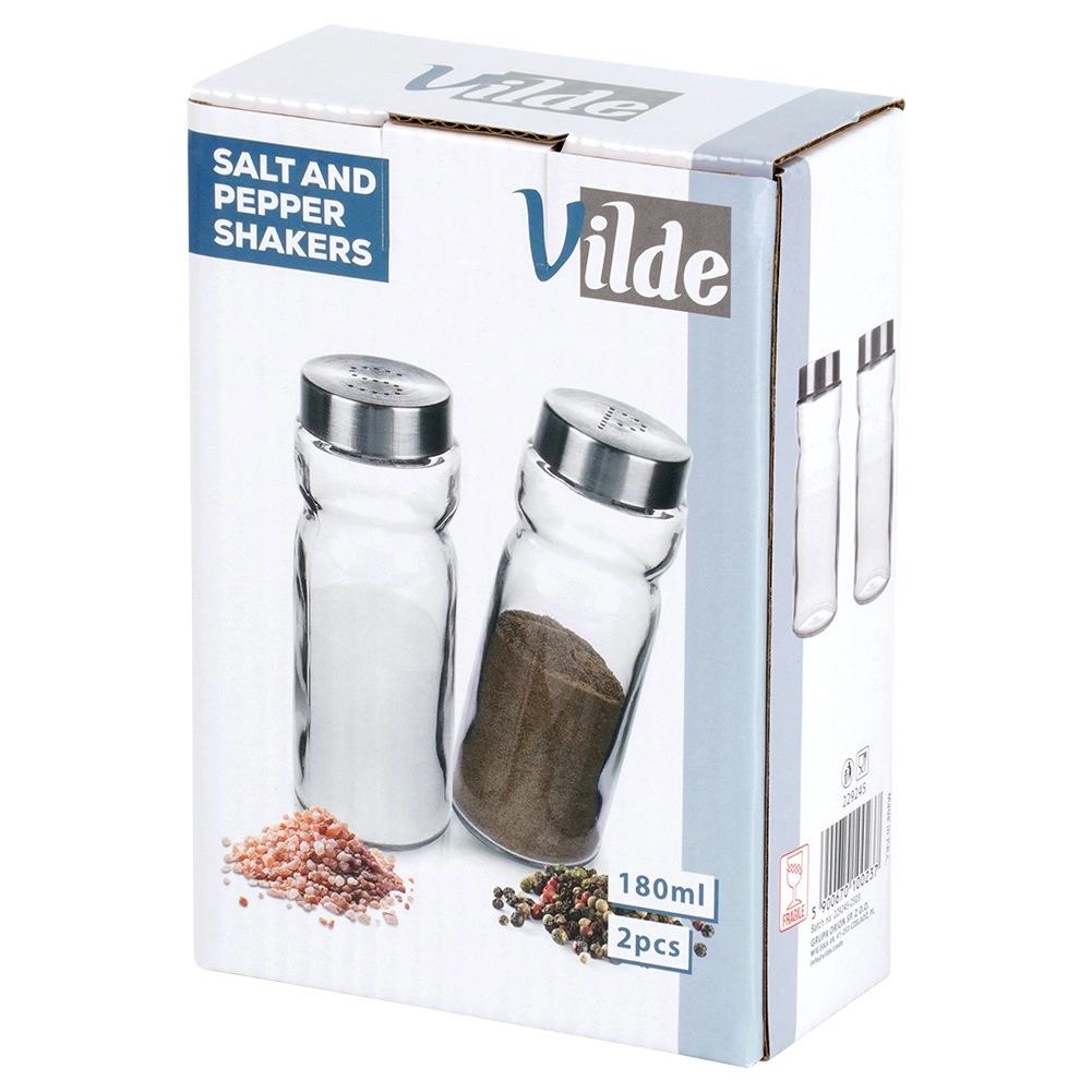 Découvrez le lot pratique de deux pots à épices VILDE – salière et poivrière en verre de qualité, épais, avec couvercles métalliques à l’aspect inox. Grâce au corps transparent, vous voyez toujours la quantité d’épices et pouvez les recharger à temps. Les orifices doseurs du couvercle permettent une distribution régulière et évitent de trop saler ou d’assaisonner excessivement.