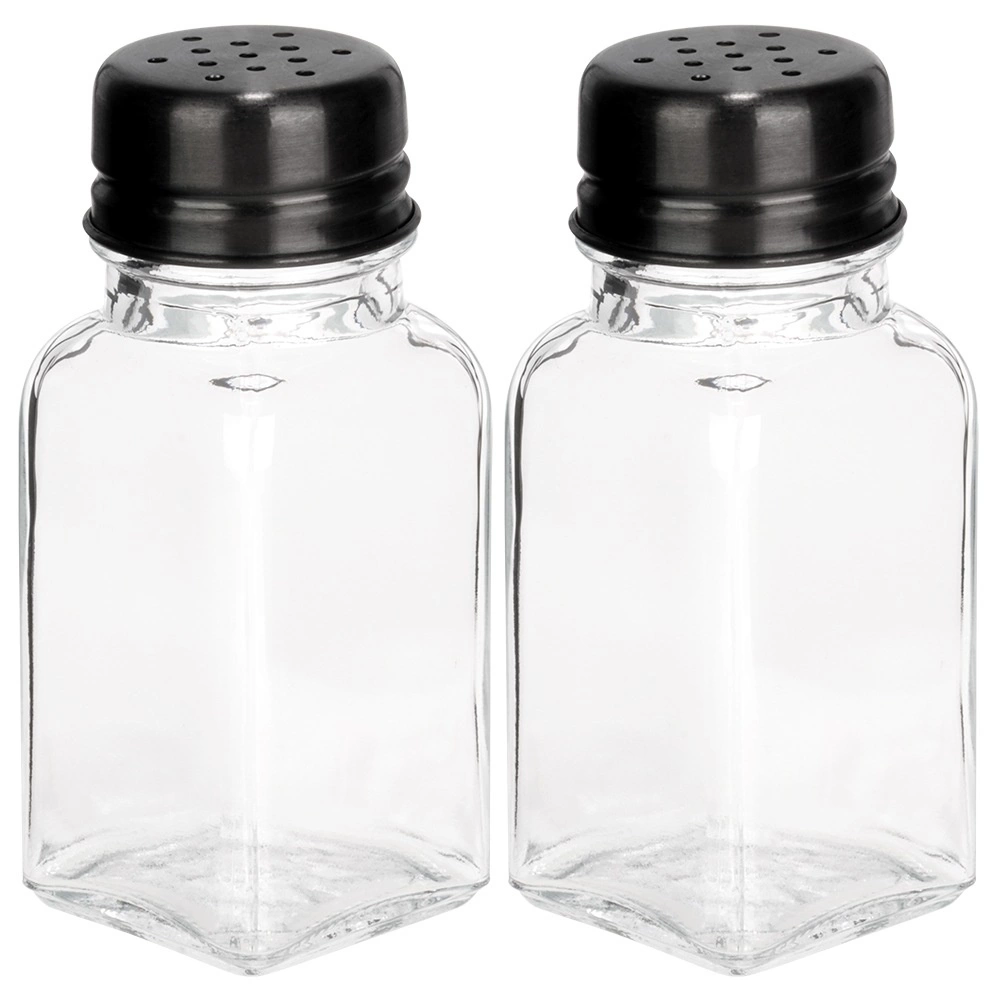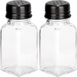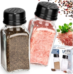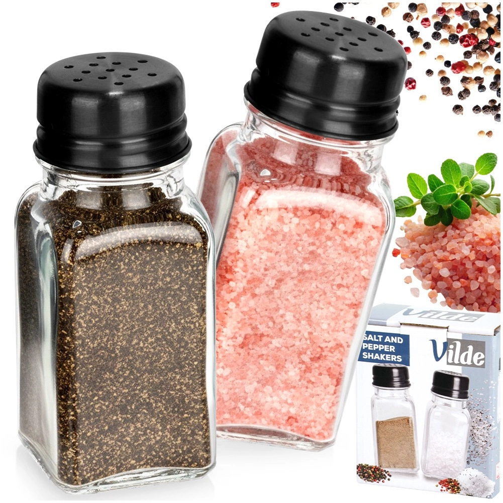 Ensemble pratique de deux pots à épices – salière et poivrière – en verre transparent épais avec couvercles métalliques noirs. Chaque récipient a une capacité de 80 ml et des dimensions de 4 × 4 × 9,5 cm. Grâce aux bouchons perforés, vous dosez les épices facilement et avec précision, vous préservez leur fraîcheur et leur arôme et vous avez toujours les condiments à portée de main à la maison comme en restauration.