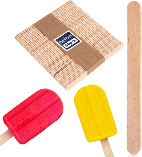 Pratique lot de 50 bâtonnets en bois pour glaces de dimensions 9,5 × 1 × 0,2 cm pour la fabrication maison de glaces, sorbets et desserts. Les bâtonnets en bois de hêtre sont sûrs pour le contact alimentaire, robustes et durables. À utiliser aussi pour des activités créatives, à l’école comme à la maison. Produit original de la marque ORION fabriqué selon les normes européennes.