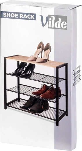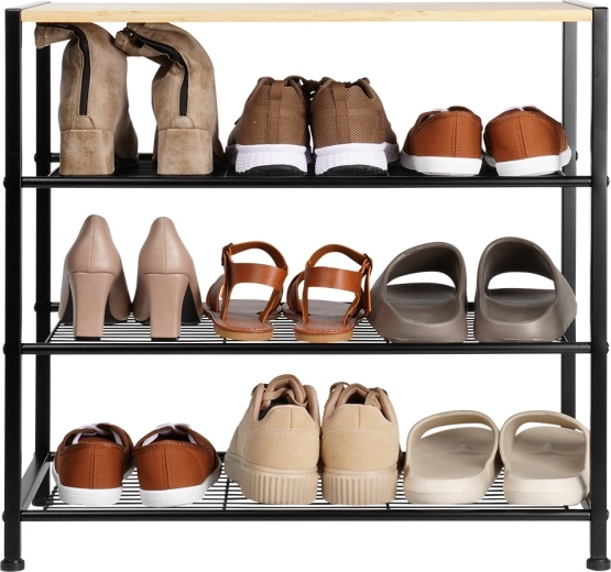 Ce meuble à chaussures à quatre niveaux est une solution idéale pour organiser les chaussures dans tout foyer. La structure métallique avec finition poudre noire garantit durabilité et stabilité, tandis que la plateau supérieur en bambou offre un espace pour les sacs, les clés ou d’autres accessoires. Grâce à ses dimensions bien pensées, il s’intègre même dans les espaces réduits et garde vos chaussures bien rangées en un seul endroit.