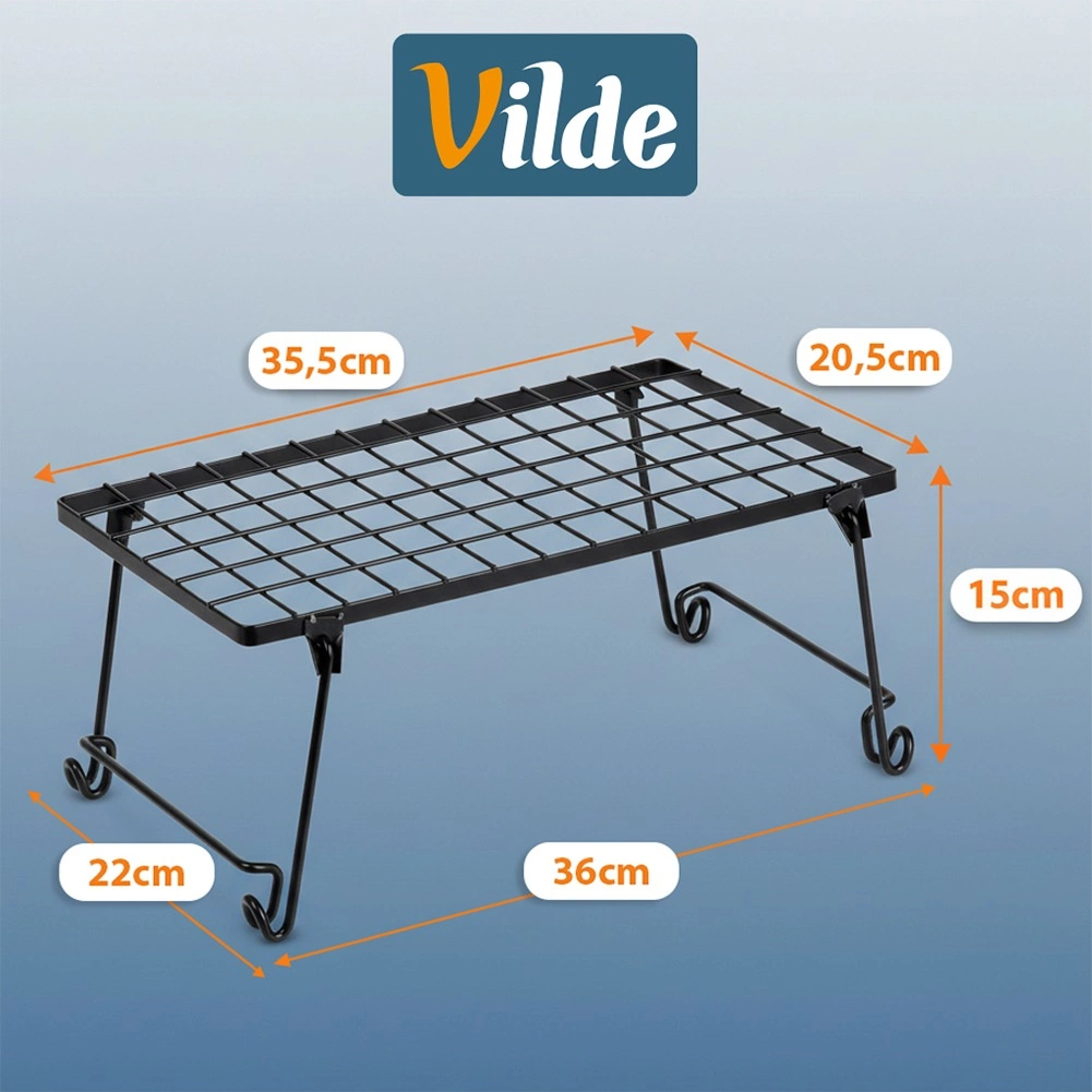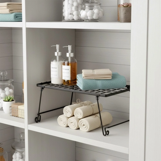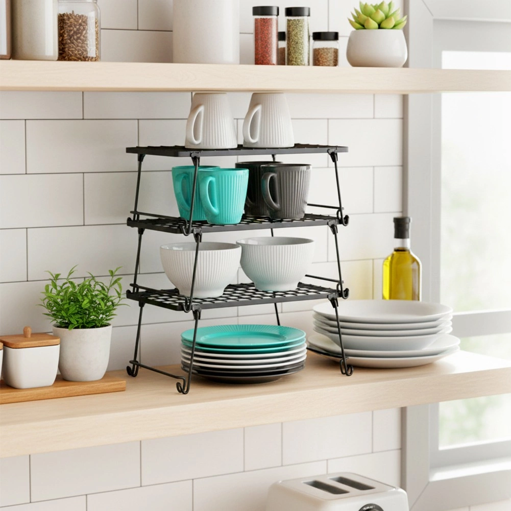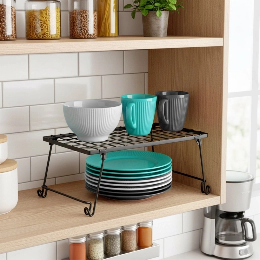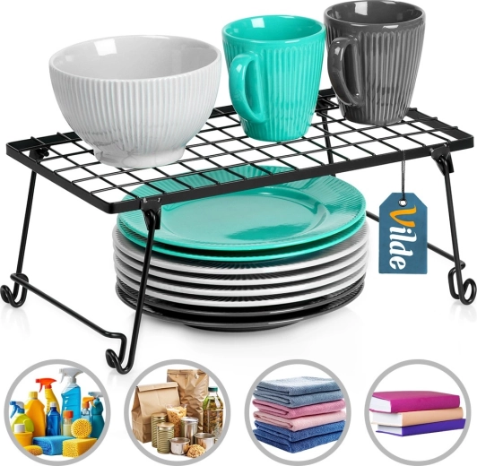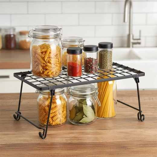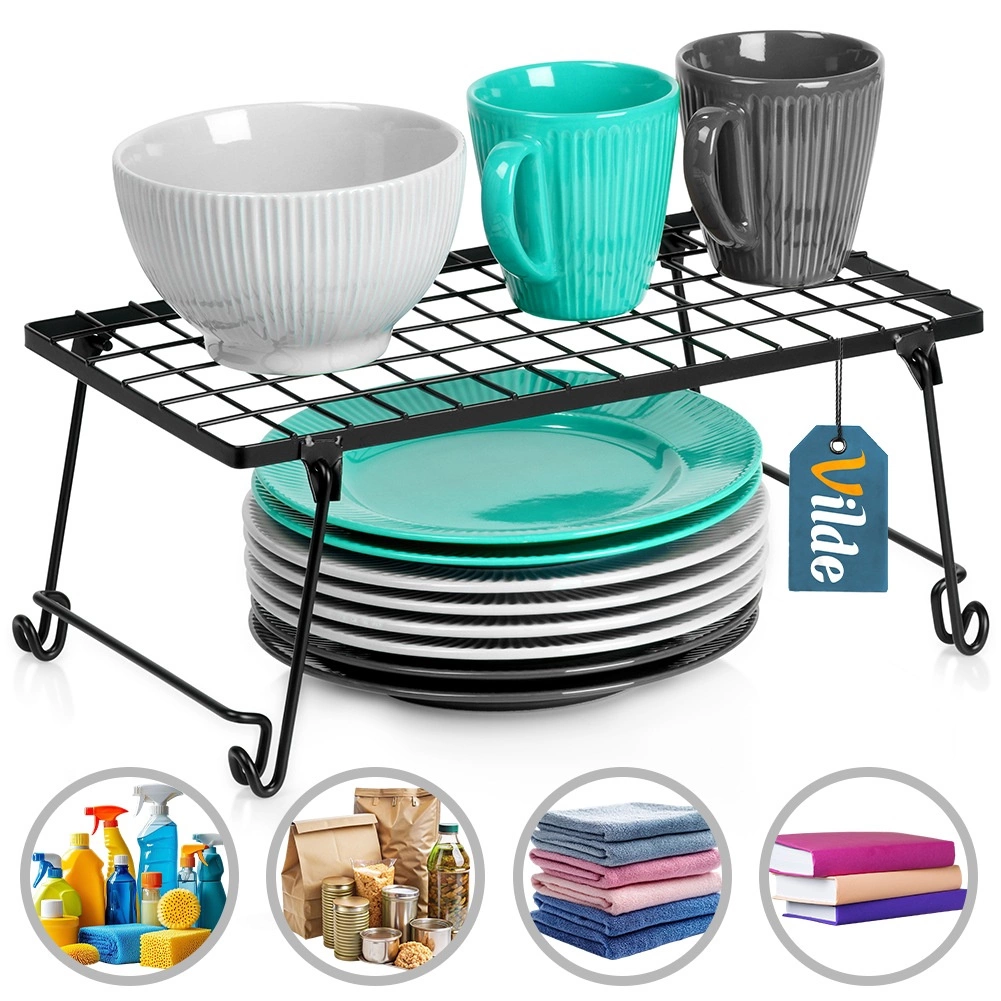 Pratique étagère de cuisine en métal résistant de couleur noire pour une meilleure organisation de l’espace. Idéale pour les épices, assiettes, tasses ou bols. Grâce à ses dimensions 36 × 22 × 15 cm, elle divise efficacement une armoire en deux niveaux et crée un espace de rangement supplémentaire. Structure stable, design pliable et look moderne et minimaliste adaptés à tout intérieur.