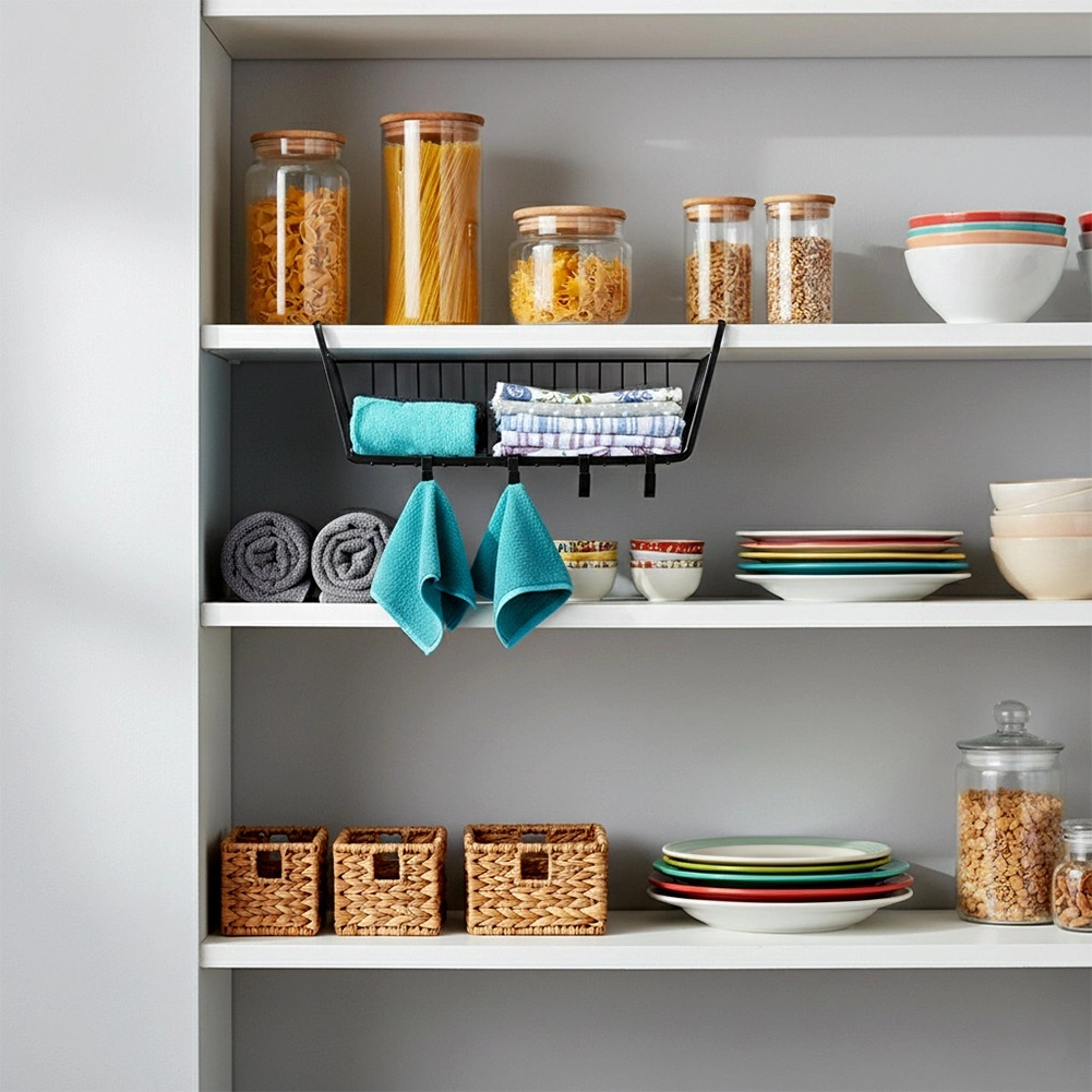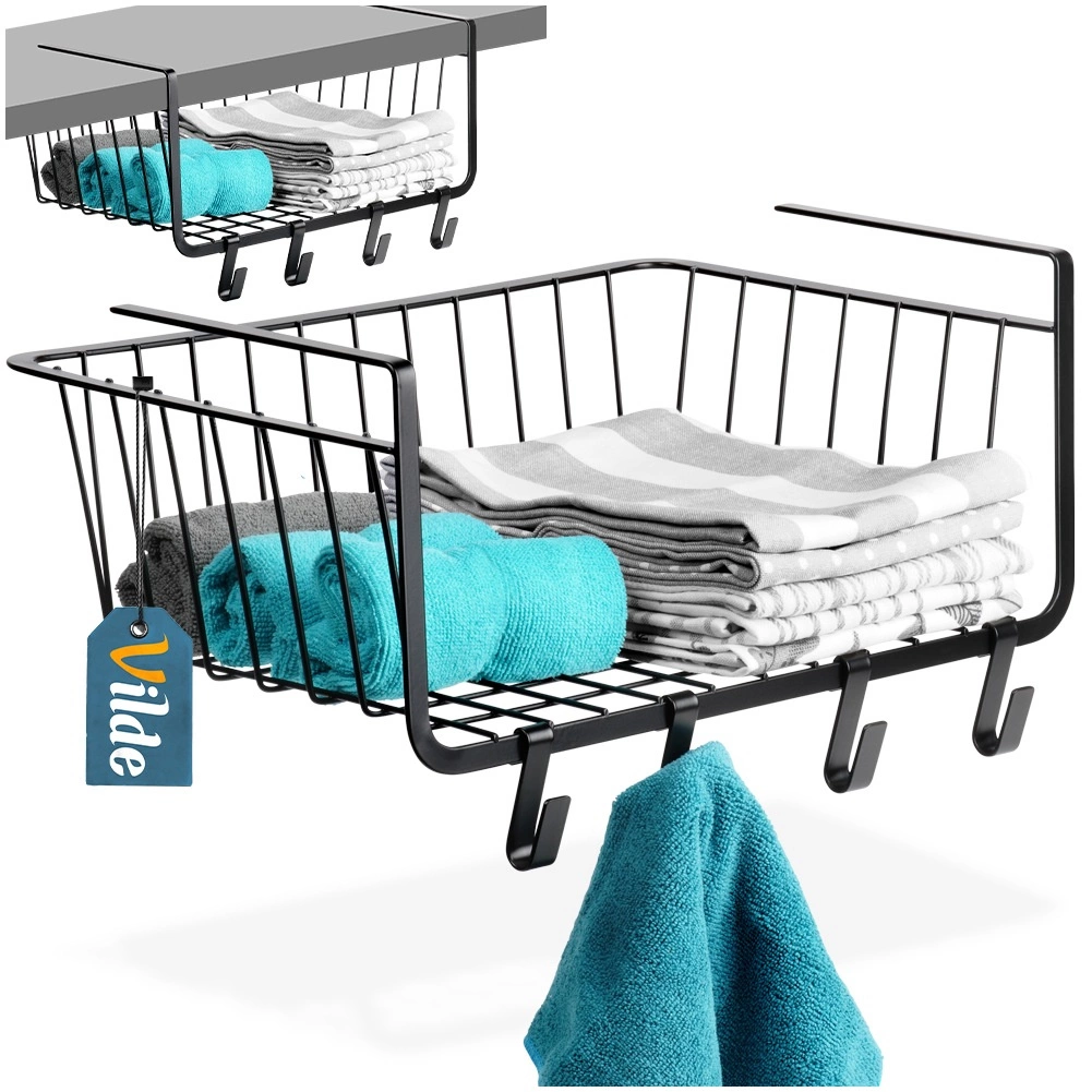 Organisez votre intérieur intelligemment et sans perçage. Il suffit de glisser le panier sous une étagère ou sur une barre de crédence pour obtenir immédiatement un espace de rangement supplémentaire pour garder à portée de main ustensiles de cuisine, accessoires de salle de bain ou textiles. L’emballage comprend 4 crochets pratiques pour suspendre torchons, maniques ou petits accessoires.