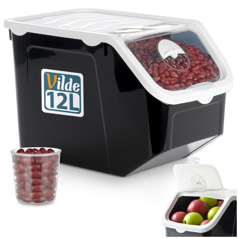 Pratique récipient de cuisine de 12 l pour fruits, légumes et denrées sèches. Il possède une aération réglable dans le couvercle, une trappe frontale transparente basculante pour un dosage facile et un couvercle hermétique pour une fraîcheur prolongée. Inclus un doseur 40–160 ml. Fabriqué en plastique sûr sans BPA, adapté au contact alimentaire, congélateur et lave-vaisselle, résistance thermique -20 °C à 100 °C.
