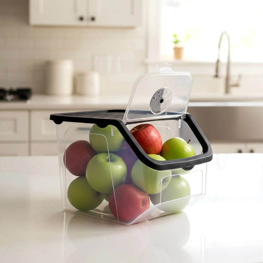 Gardez l’ordre dans la cuisine avec cette boîte polyvalente de 12 l, idéale pour stocker oignons, pommes de terre, ail, fruits et aliments secs. Grâce à sa transparence, vous contrôlez en permanence le contenu et le couvercle avec clapet rabattable permet un accès rapide sans devoir ouvrir tout le récipient.