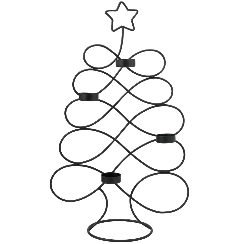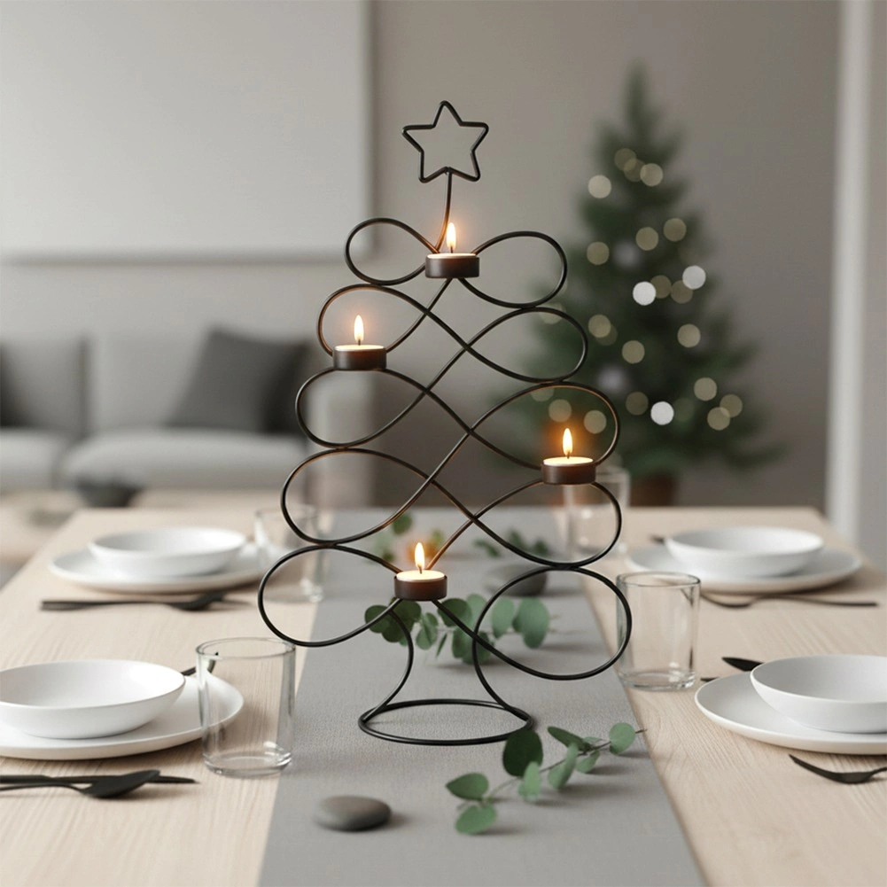 Élégant chandelier en métal en forme de sapin, hauteur 49 cm, avec quatre emplacements pour bougies chauffe-plat, créant une atmosphère chaleureuse et une décoration festive moderne. Son design minimaliste en noir s’harmonise parfaitement avec les intérieurs de style loft et scandinave, et sa base stable garantit une utilisation en toute sécurité.