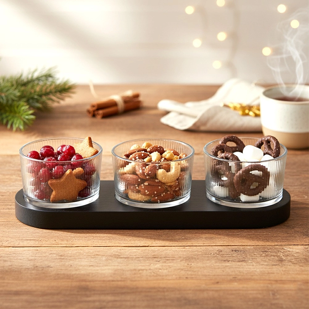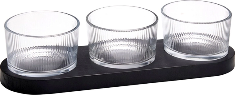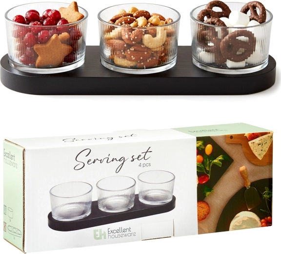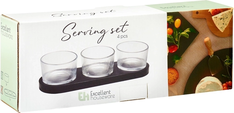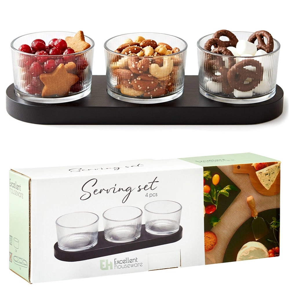 Élégant ensemble de 4 pièces pour servir des amuse-bouches, combinant trois coupelles en verre et un plateau rectangulaire en bois de couleur noire. Idéal pour sauces, dips, olives, noix et antipasti. Design moderne avec verre cannelé et logements de stabilisation assurant un service pratique et stylé.