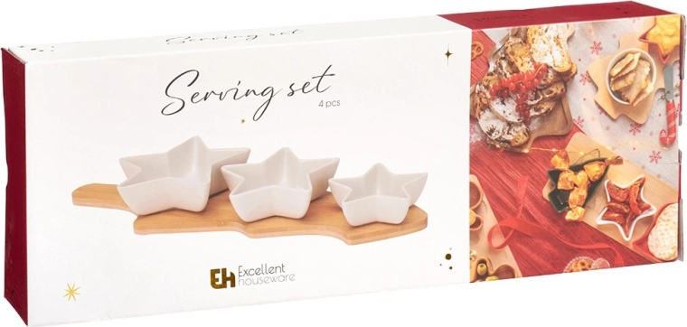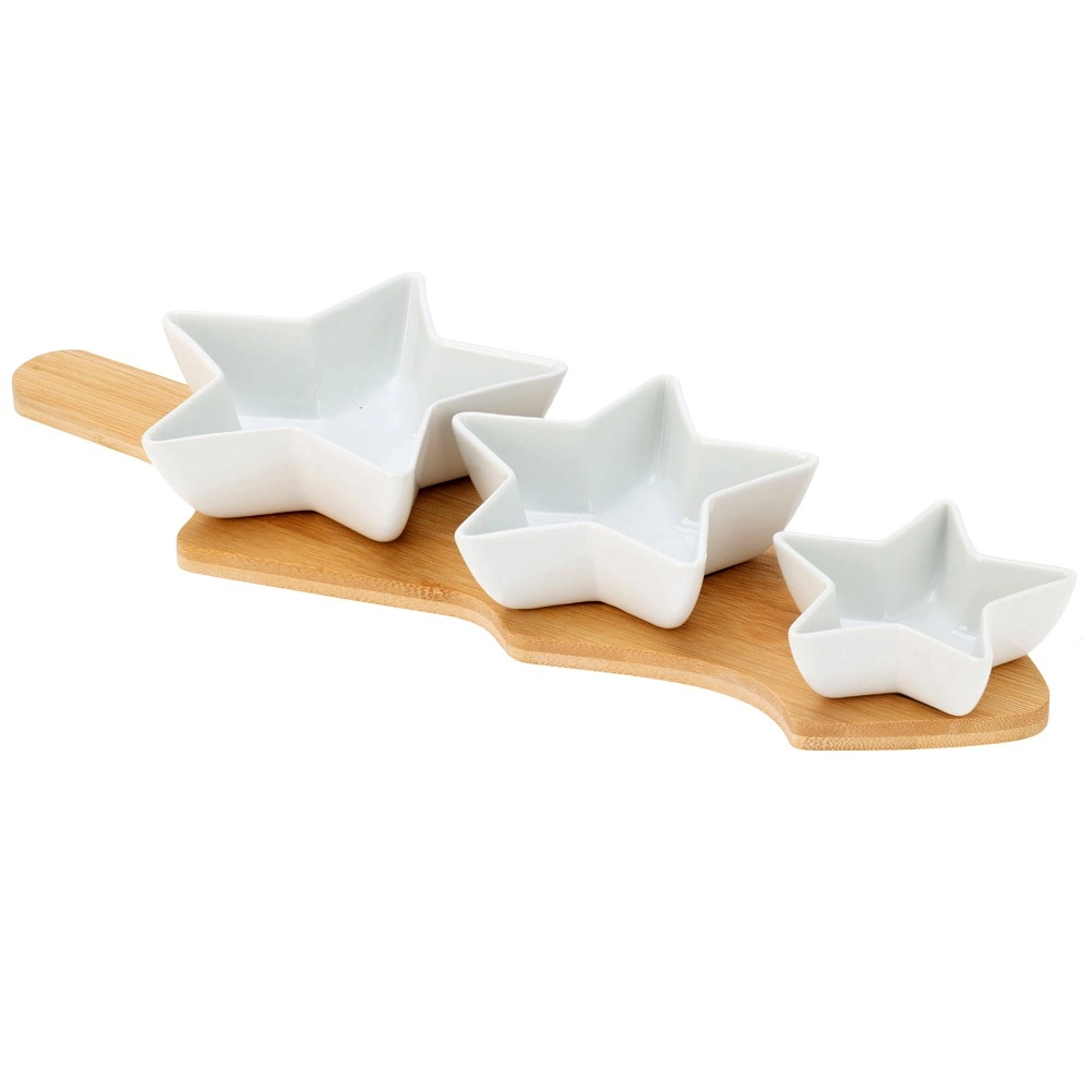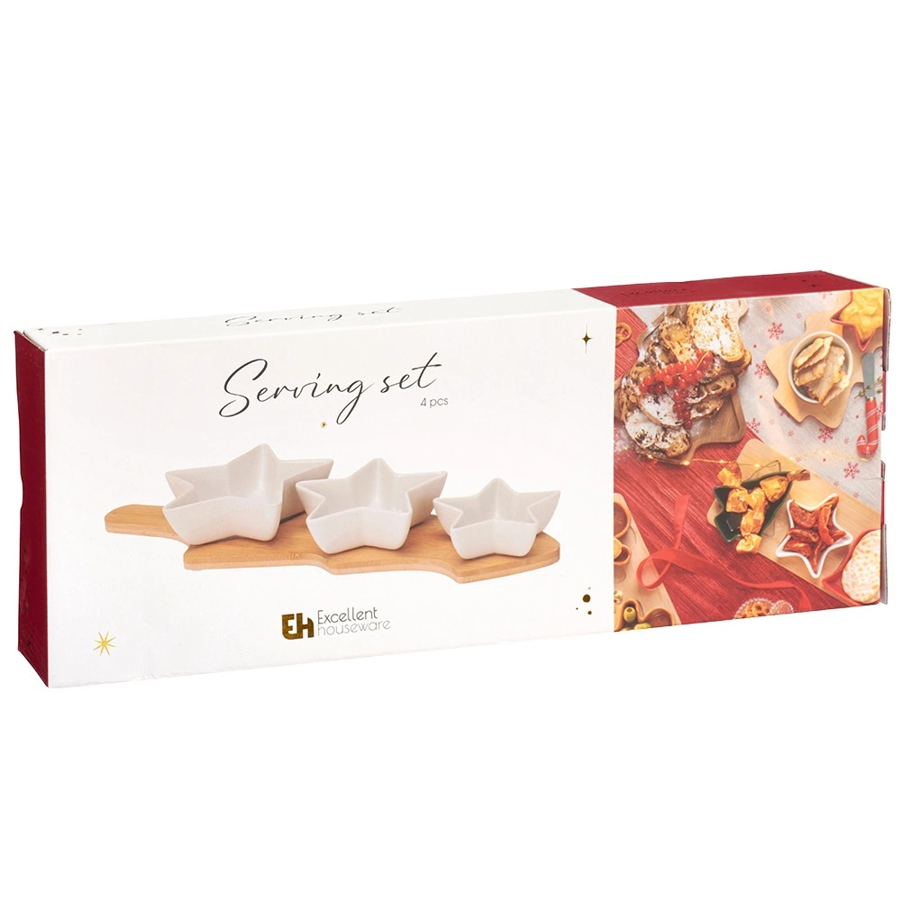 Set élégant de 4 pièces pour le service avec des coupelles en porcelaine en forme d’étoile et un plateau en bambou en forme de sapin. Idéal pour un service raffiné de noix, olives, dips et petites gourmandises. La porcelaine de qualité blanche et le bambou naturel forment une combinaison harmonieuse qui embellira toute table de fête.