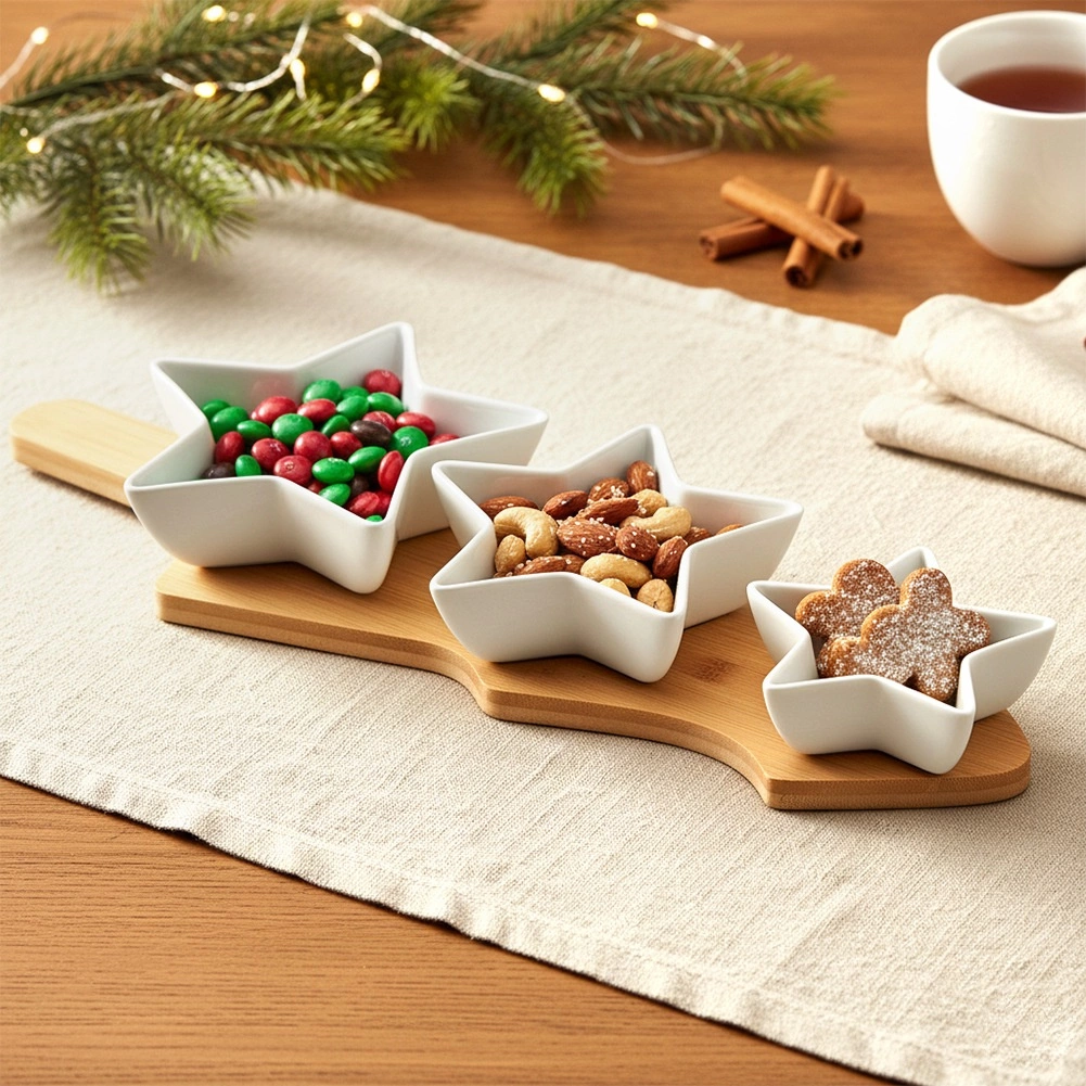 Ce set design allie l’élégance de la porcelaine blanche au look naturel du bambou. Trois coupelles en forme d’étoiles s’emboîtent solidement dans les évidements précisément fraisés du plateau en forme de sapin de Noël, évitant ainsi tout glissement lors du transport. Une solution parfaite pour les repas de fête, les célébrations familiales et le service au quotidien.