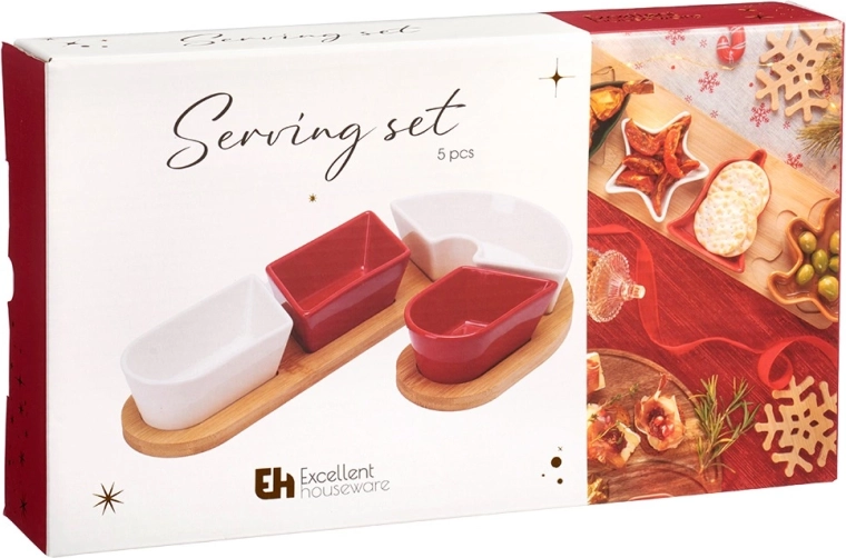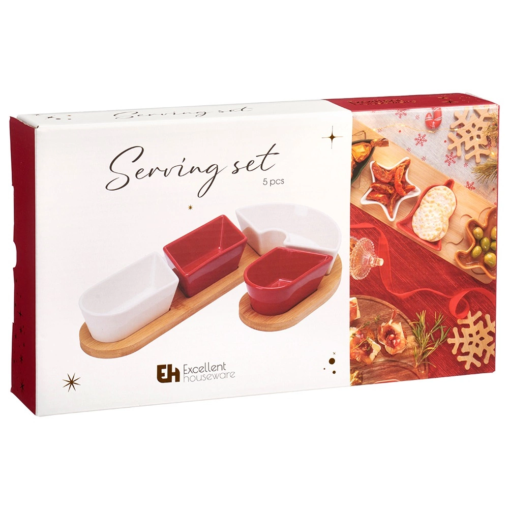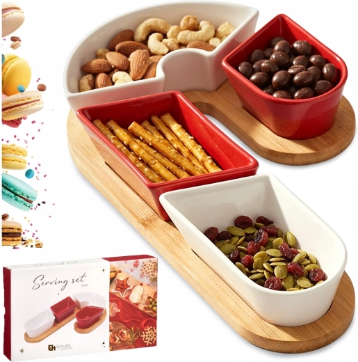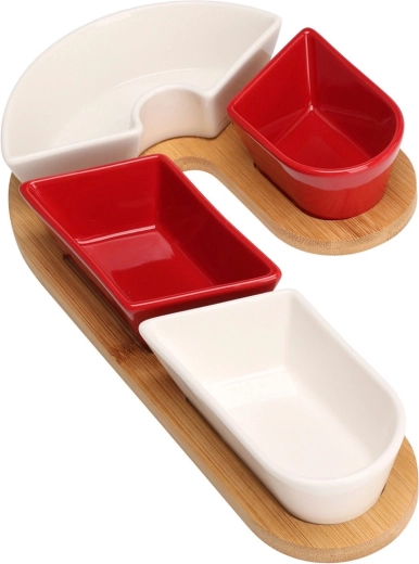 Un élégant set de service 5 pièces avec un plateau en bambou en forme de sucre d’orge transformera votre table en une décoration festive. Il comprend quatre coupelles en céramique résistantes en rouge et blanc et un plateau en bambou parfaitement moulé pour un maintien stable. Idéal pour en-cas, dips, sauces et antipasti. Dimensions totales du set : 29 × 17 × 4,5 cm.