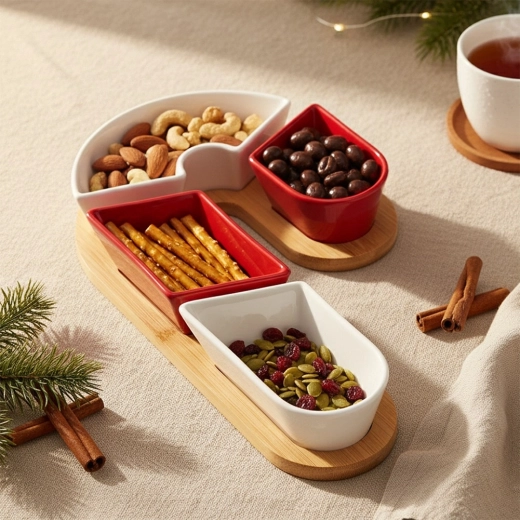 Créez une ambiance festive unique avec ce set de service élégant en forme de sucre d’orge. Les coupelles en céramique dans l’intemporelle combinaison de blanc et de rouge sublimeront votre table, tandis que le plateau en bambou avec logements fraisés maintiendra le tout en place en toute sécurité. Une solution à la fois pratique et décorative pour les dîners en famille, les visites et les fêtes de fin d’année.