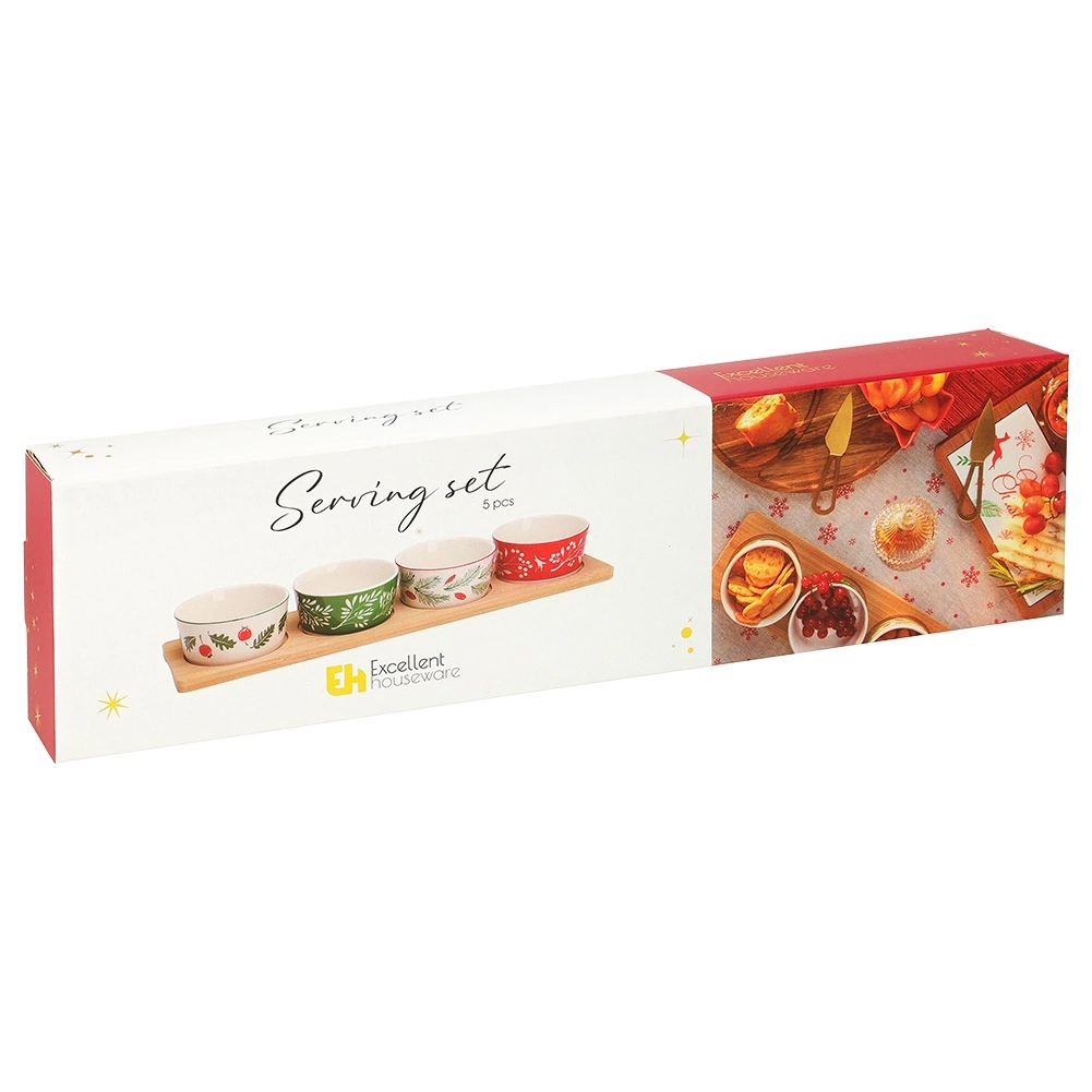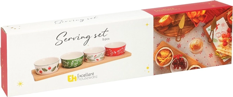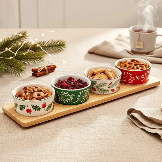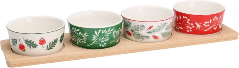 Ensemble de service élégant avec un plateau en bambou et 4 bols en porcelaine aux motifs de Noël. Idéal pour les noix, olives, dips et petites collations lors des réunions festives. Logements stables dans le plateau pour éviter que les bols ne glissent, bols en porcelaine compatibles lave-vaisselle. Dimensions du plateau 38 × 10 × 4,5 cm, bol 8,5 × 4 cm, capacité 140 ml.