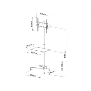 Grâce au profil arrière étroit des pieds, le support peut être placé près d’un mur ou d’un meuble afin d’économiser de l’espace. Le tube principal peut être démonté pour le transport, ce qui permet de charger facilement le support et de le remonter rapidement. Les roulettes pivotantes avec frein assurent un déplacement fluide et un verrouillage ferme sur place.