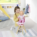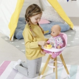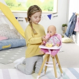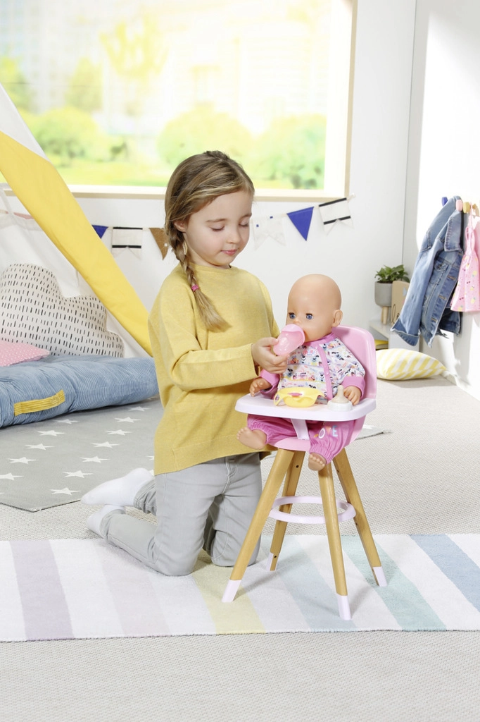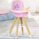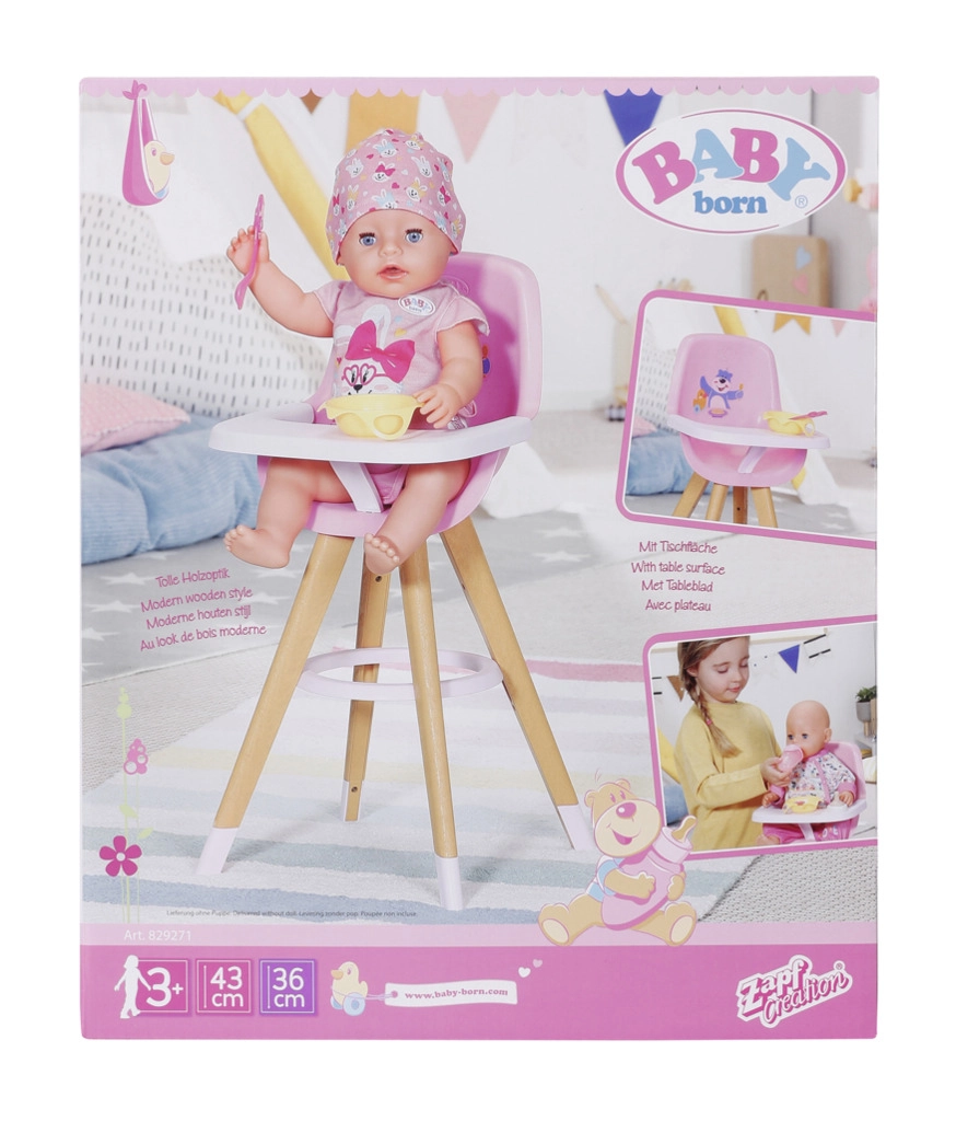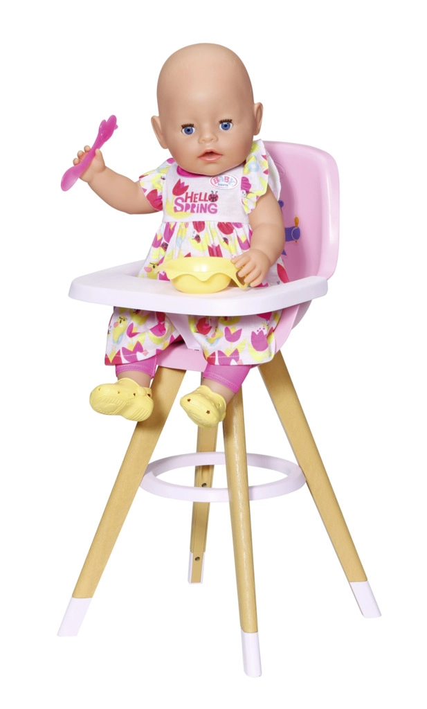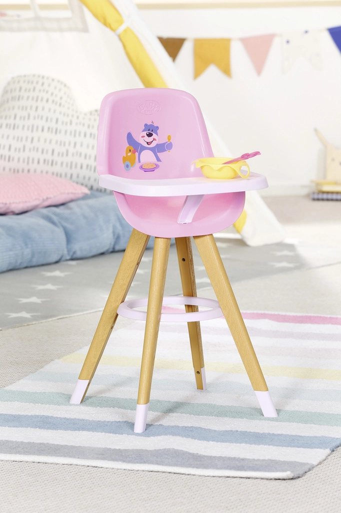 Une chaise haute stylée pour poupées BABY born au design nordique qui offre aux enfants un jeu créatif d’alimentation. Elle possède des pieds stables aspect bois, un siège rose confortable et une tablette amovible offrant suffisamment de place pour une assiette, un biberon et d’autres accessoires. L’adorable motif avec un ourson et un petit canard ravira les petits soigneurs, et la chaise convient aussi aux poupées plus petites.