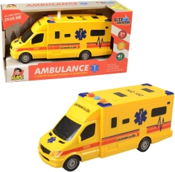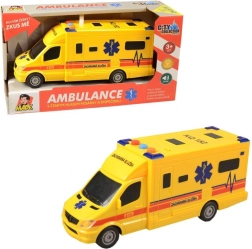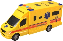 Ambulance jouet réaliste à friction avec effets lumineux, sirène et messages vocaux du dispatching et de l’équipage. Fabrication en plastique, longueur env. 19 cm, idéale pour les garçons et les filles dès 3 ans.