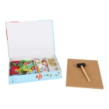 plaque en liège, pièces en bois et en carton pré-percées, petits clous, marteau en bois, 4 modèles recto verso, boîte de rangement