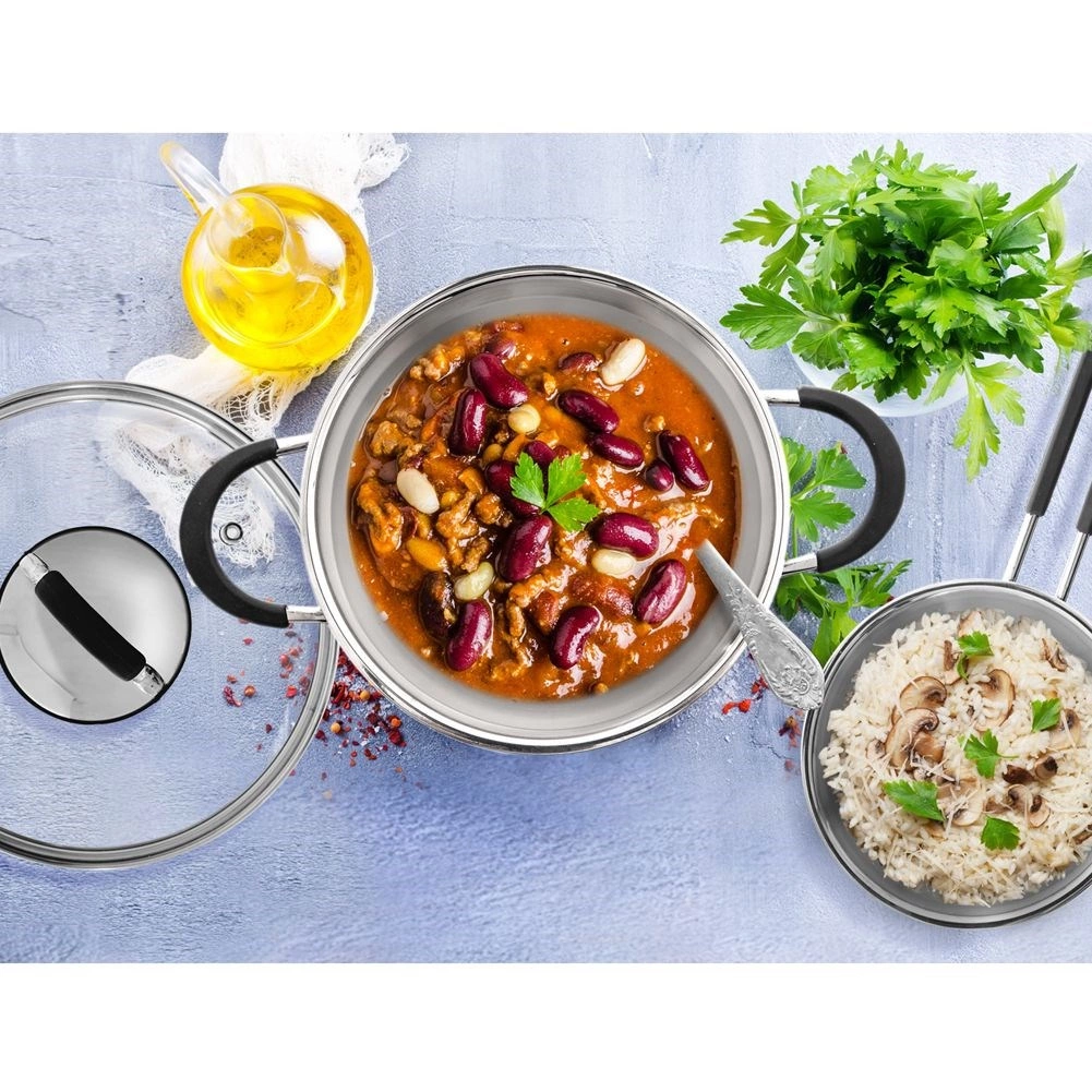 Son design élégant en inox est du plus bel effet dans la cuisine comme sur la table. La casserole convient pour les soupes, sauces et plats mijotés.