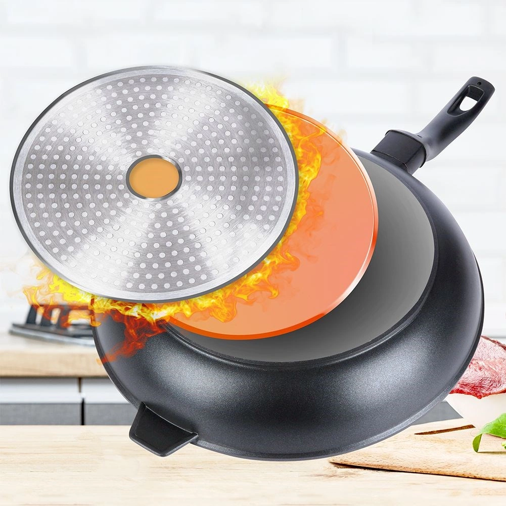 Le fond multicouche avec disque à induction assure un transfert de chaleur efficace et une compatibilité avec le gaz, l’électricité, la vitrocéramique, l’halogène et l’induction.