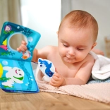 Des illustrations simples d’animaux marins soutiennent les premiers apprentissages, l’enrichissement du vocabulaire et la concentration pendant le bain.