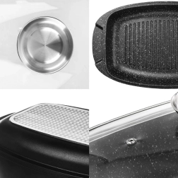 Grâce au doseur intégré dans le couvercle en verre, vous pouvez aisément ajouter eau, bouillon ou vin pendant la cuisson sans soulever le couvercle. Les deux parties (plat à rôtir et poêle grill) sont compatibles avec tous les types de plaques, y compris l’induction, et peuvent être utilisées au four jusqu’à 200 °C. Des poignées latérales pratiques facilitent la manipulation et l’ensemble passe au lave‑vaisselle.