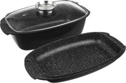 Ensemble granit pratique pour la cuisine quotidienne : plat à rôtir profond 5 l, poêle grill servant aussi de couvercle et couvercle en verre résistant à la chaleur avec doseur. L’aluminium coulé robuste avec double revêtement PFLUON GRANIT accumule parfaitement la chaleur et assure une cuisson uniforme avec un minimum d’huile.