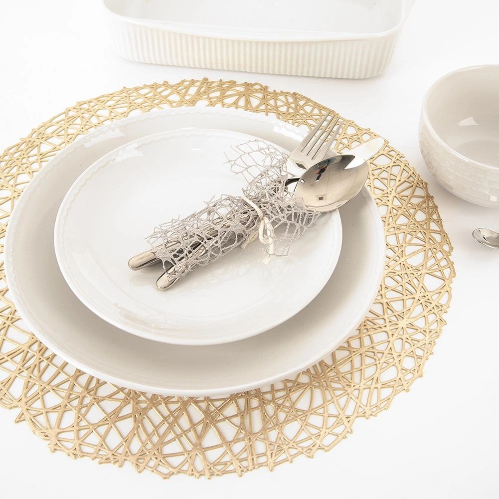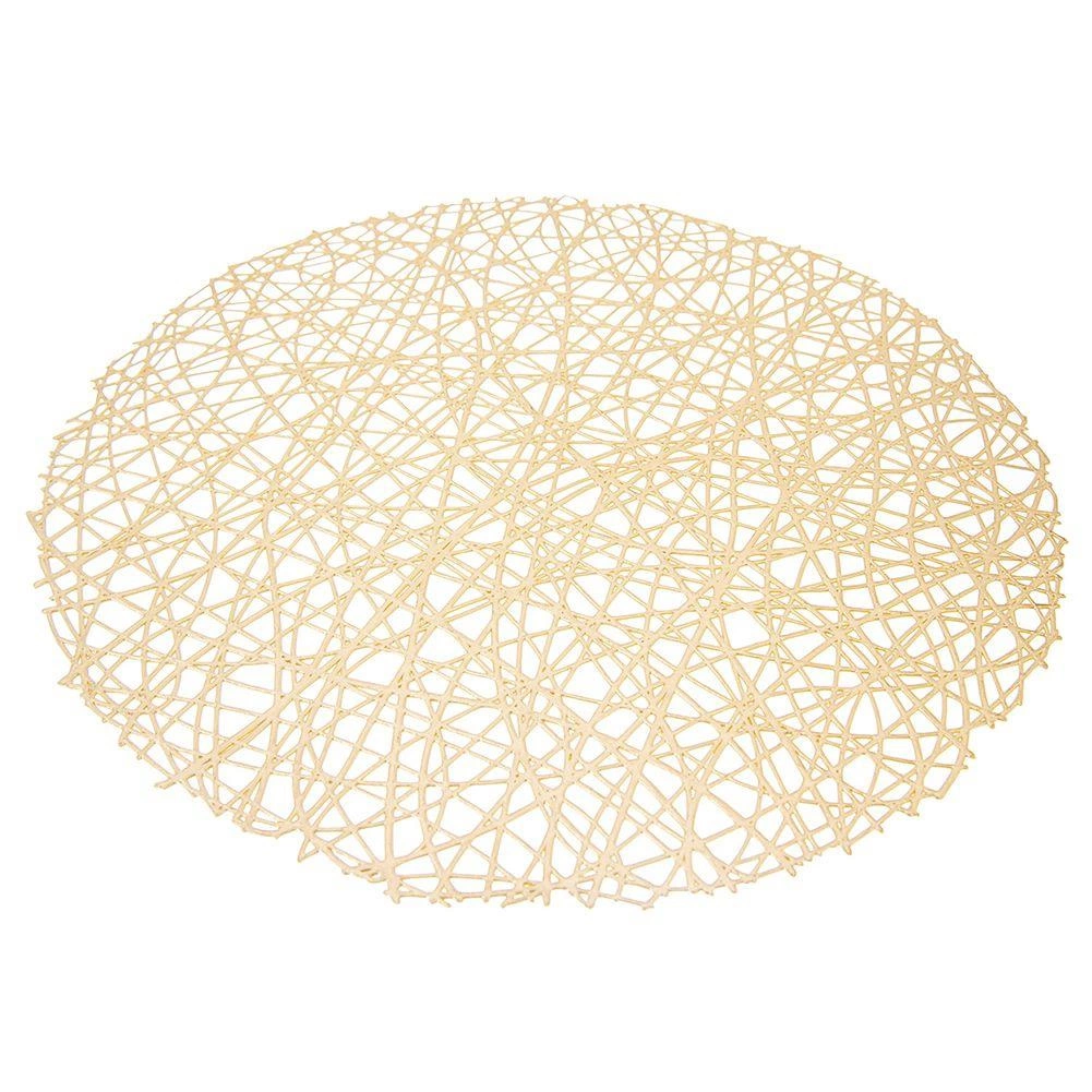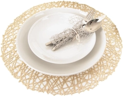 Ce set de table rond de 39 cm de diamètre, en coloris doré, apporte une touche de luxe à votre table tout en l’assurant une protection fiable. Il est souple, facile à nettoyer et pratique pour un usage quotidien dans la cuisine comme dans le salon. Il protège la surface des rayures et des salissures et constitue un arrière-plan décoratif pour assiettes et couverts.